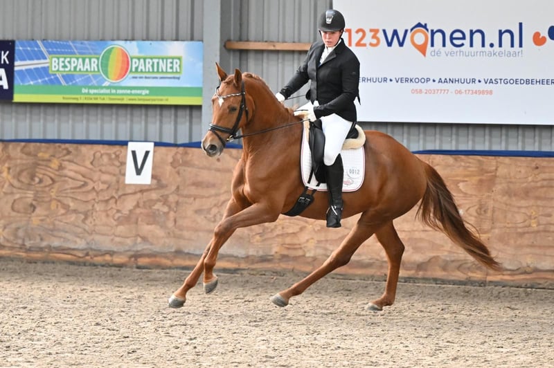 Cette jument a été championne lors de la sélection des juments de Gelderland/Flevoland cette année, dans la catégorie des juments de 4 ans et plus. Il y a deux semaines, elle a passé une inspection IBOP avec une note globale de 82 points : 7,5 en pas, 8,5 en trot, 8,5 en galop, 8,0 en souplesse, 8,5 en attitude et équilibre, 8,5 en dressage, et 8,0 en aptitude à l’équitation. N’étant pas encore évaluée par un vétérinaire agréé, elle possède actuellement le label « Qualifiée » mais pas encore « Élite ». Elle est actuellement engagée avec succès en dressage niveau L2. Sa mère est classée en Inter I et est en entraînement pour Inter II. À 5 ans, sa mère a participé au championnat du monde des jeunes chevaux. De la même mère proviennent également deux étalons agréés, dont Dutch Dream. Radiographies disponibles. Attention ! Tous nos prix sont hors TVA de 21 %.