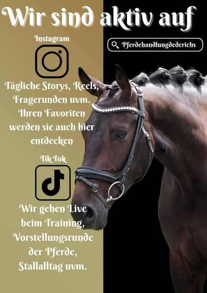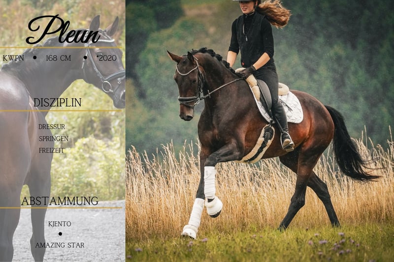 Pleun ist eine 5 Jährige KWPN Stute ca. 1,69 cm v. Kjento x Amazing Star *Pleun* ist ein überragendes Nachwuchspferd mit 3 sehr guten GGA. Sie ist wunderschön und bringt einen unglaublich lieben und coolen Charakter mit. Pleun ist super rittig und unkompliziert, hat Qualität fürs große Viereck - einfach ein traumhaftes Pferd. Sie arbeitet immer gut mit und lässt sich problemlos auf jeden Spaß dazu ein. Reiten auf dem Halsring, einen Sprung machen, alleine oder in der Gruppe ins Gelände, Pleun macht alles mit. Fremde Umgebungen nimmt sie auch gelassen hin. Planen, bunte Hindernisse, Lärm usw. stören sie nicht. Sie bringt mehr mit als man sich erträumen kann. Auf ihr hat man immer ein sicheres gutes Gefühl. !!! SCHAUEN SIE SICH UNBEDINGT IHR VIDEO AN !!! Im Umgang völlig unkompliziert, gut erzogen und schmusig. Sie bringt eine große aktuelle AKU mit. Verpassen Sie nicht die Chance auf solch ein Pferd. Ein aktuelles Video finden Sie hier in der Anzeige oder unter folgendem Link: https://www.youtube.com/watch?v=YzpUSiVcPNU Pferdehandlung Dederichs – Ihr Partner für den Pferdekauf Kontakt & Erreichbarkeit: Anfragen bitte ausschließlich telefonisch unter 0173/9792139 Montag – Freitag: 09:00 – 18:00 Uhr Samstag: 09:00 – 15:00 Uhr Sonntag: Ruhetag Folgen Sie uns auf Social Media! Erleben Sie unseren Alltag mit den Verkaufspferden auf Instagram, TikTok & Facebook unter Pferdehandlung Dederichs Rabatt: Bei sofortiger Mitnahme Ihres neuen Traumpferdes erhalten Sie zwischen 5 %– 10 % Rabatt Probereiten & Vorführen: • Probereiten: 30 € pro Pferd (max. 2 Reiter), Betrag wird beim Kauf angerechnet • Feiertage: Proberitt 50 € • Vorführung durch unsere Bereiter: 25 € pro Pferd (Vorreiten, Bodenarbeit etc.) Ankaufsuntersuchung & Transport: • Viele unserer Pferde besitzen bereits eine AKU • Sie können selbstverständlich Ihren eigenen Tierarzt mitbringen • Gerne organisieren wir eine Untersuchung • Wir unterstützen Sie auch gerne beim Transport ins neue Zuhause Weitere Verkaufspferde: In unserem Stall stehen weitere Verkaufspferde, die noch nicht online sind. Falls Ihr Traumpferd noch nicht dabei ist, zögern Sie nicht, uns zu kontaktieren. Wichtige Hinweise: • Stockmaß-Angaben sind geschätzt und nicht exakt nachgemessen • Alle Beschreibungen sind subjektive Einschätzungen des Verkäufers und keine zugesicherten Eigenschaften