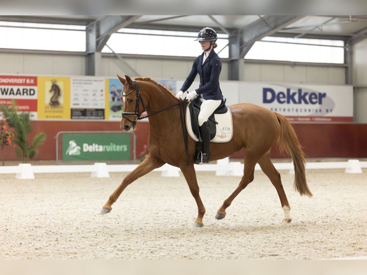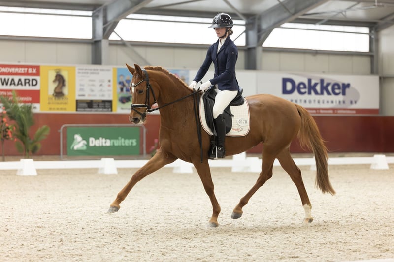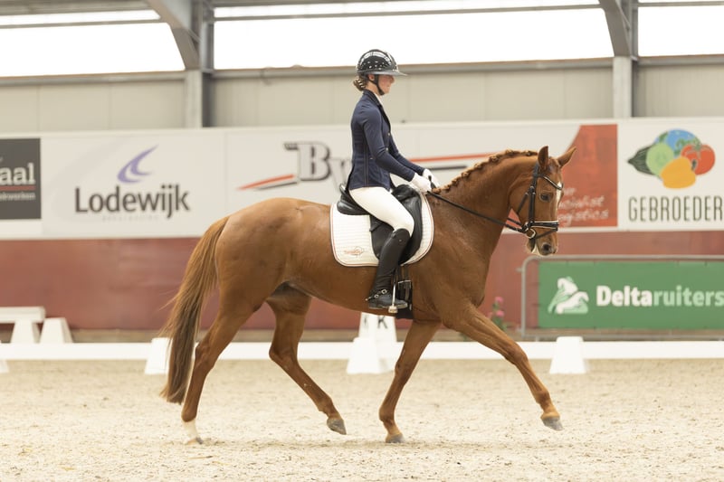 We bred this mare ourselves. Her sire is our own licensed stallion, Kingsley Tarpania. This stallion has already been sold to Australia. Her dam, Hattrick, has competed in the Light Tour, and her half-sister, Palmspring, is also for sale. Two very different horses, but both are very sweet mares in terms of temperament. We only recently backed this mare under saddle. She recently competed in a show with a young rider of ours, and she performed excellently — very well-behaved. She is still somewhat green for her age. The horse moves with a very relaxed and easy way of going. X-rays can be provided upon request and serious interest. These include views of the hooves, as well as the neck and back. They have been examined and approved by our veterinarian, and the report is available. Please note, a 21% VAT must be added!