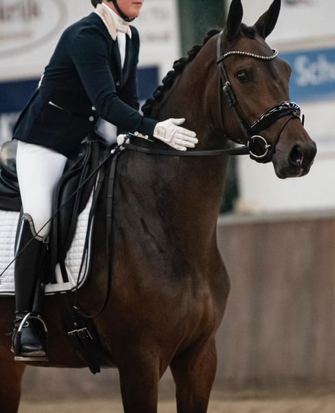 New Style es una yegua de 8 años, elegante y de élite, procedente de una línea de cría muy destacada en el deporte. Está clasificada en doma M y ha ganado casi todas las competiciones en las que ha participado. Hasta ahora, nunca ha obtenido menos del 68 %. Está completamente exenta de problemas radiológicos y no presenta defectos (en el establo). Se disponen de fotos que incluyen la espalda y el cuello. New Style es una yegua cariñosa y sensible. Es fácil de manejar y de montar, con mucha elasticidad y disposición para el movimiento. Tiene una gran aptitud para la doma, pero también disfruta mucho de paseos en el exterior, cross y saltos. No tiene miedo y le gusta la variedad. Es especialmente adecuada para un jinete que aprecie un caballo sensible e inteligente, con carácter y energía. Procede directamente del criador. Como potra fue campeona y participó en el Campeonato Nacional (NMK). Su familia, incluyendo a la abuela Vienna D, puede verse aquí. Es una yegua interesante tanto para la competición como para la cría. De la línea materna provienen varios caballos de alto nivel, incluyendo LT y GP. New Style ya tiene dos crías magníficas. En la inspección, obtuvo 80 puntos en movimiento y 80 en conformación. New Style: Incognito x Ampere x Jazz (Vienna D) Para más información sobre la línea de cría de New Style, visita nuestra página de Facebook ‘DALMHORSES’.