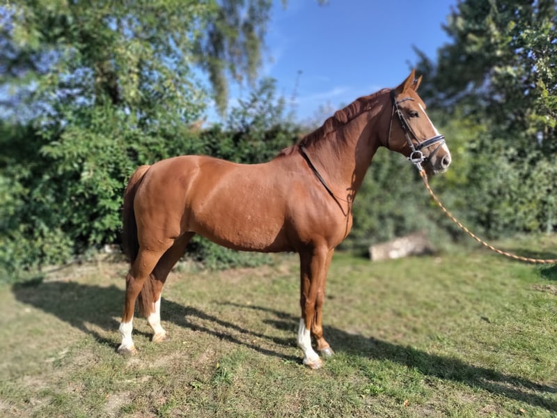 Are you looking for a beautiful mare with talent, character, and presence? Then meet our 9-year-old chestnut mare, approximately 1.70m tall. She competes at M2 level in dressage and is also familiar with the exercises of Z1. She is pleasant to ride, with plenty of work ethic. In handling, she is incredibly sweet and well-behaved. She is easy for the farrier and to harness. She is not an absolute beginner's horse, but requires an advanced rider.