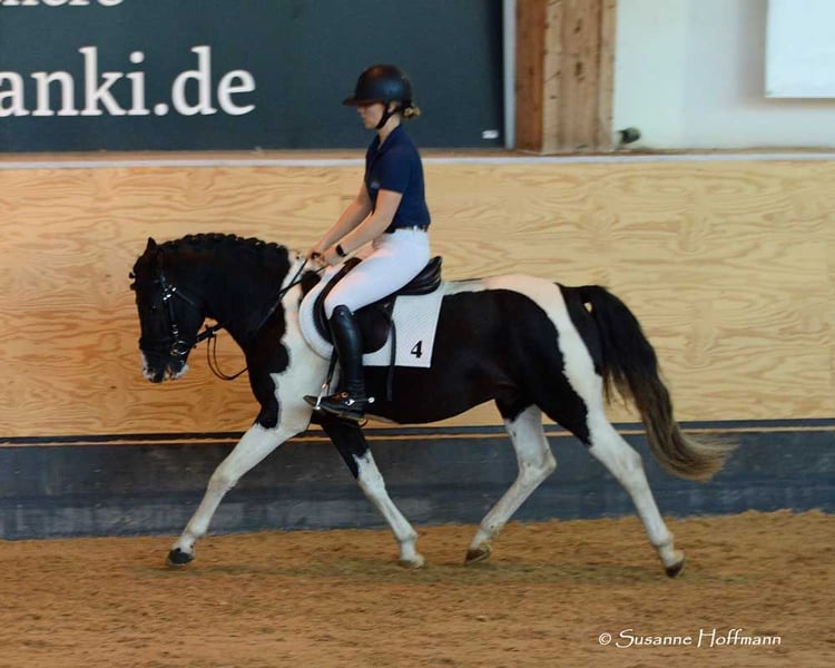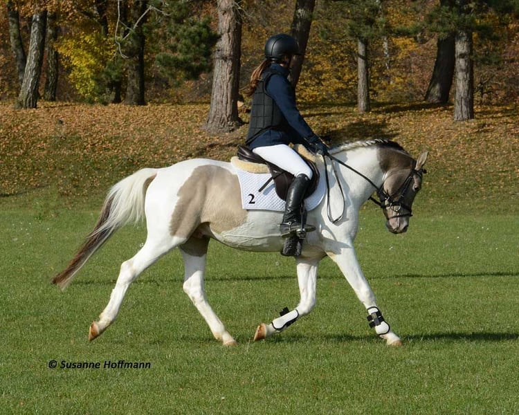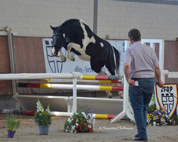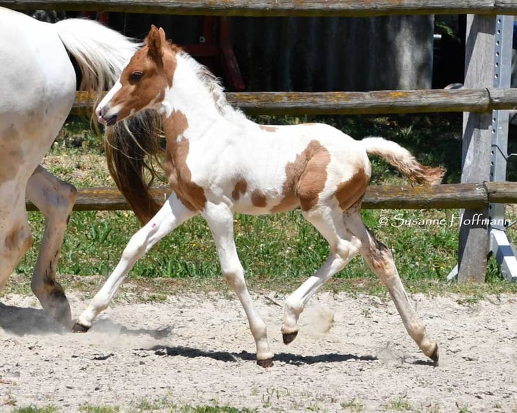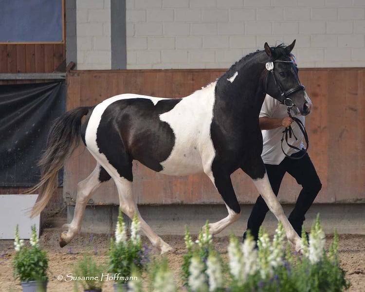 Our Salazar Sky was rated outstandingly at the inspection, including a perfect score of 10.0 for movement! He is predestined for a sporting career, as he possesses everything needed for success. He comes from very rideable, performance-oriented lines and already shows his tremendous movements at just a few days old (in the first photos). But he also impresses with his absolute calmness and is very people-oriented. By the way, Salazar is a chestnut pinto! Following this are three photos from the inspection. His father can be seen in the next photos, and he already stood out during the licensing for his impressive jumping ability and is a performance stallion. His father is also a performance stallion and a federal champion stallion, and his full sister is a federal champion mare, both from our breeding. Salazar's mother received the highest registration scores in her year, including a 9 for type and for trot. Her father is the performance stallion Heartbreaker, who you can see in the last photos. Her mother is a direct daughter of Dark Dancer, arguably the only Lewitzer with successes in dressage up to class S** against warmbloods.