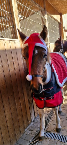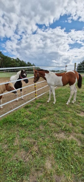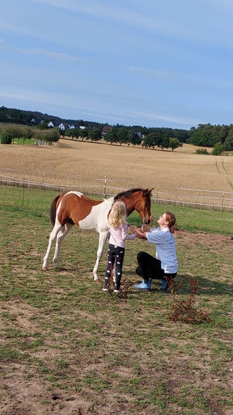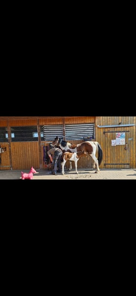 Hay, Ich bin die mega neugierige und verschmuste Maluc, geboren am 08.04.25 und wohne aktuell auf der Insel Usedom. Mein Papa ist ein eingetragener Fuchs-Schecke Lewitzer Zuchthengst aus MV und meine Mama eine Lewitzer-Stute mit bissl Pinto-Mix (beide mit Pass). Ich bekomme in den nächsten Tagen auch noch einen grünen Pass. Ich kenne den Hufschmied, andere Vierbeiner jeglicher Art und auch die mit zwei Beinen, die mich verwöhnen und begrabbeln.. Ich liebe es, angefasst zu werden und genieße da jeden Moment. Auch kann man allen Quatsch mit mir machen. Ich kenne Decken, Halfter und allgemein das Fohlen-ABC beherrsche ich schon ganz gut. Meine Mama ist den ganzen Tag noch bei mir, aber langsam muss und darf ich in die weite Welt hinaus. Ich kenne Weide, Heu, Futter aus der Schale und den Stall. Hänger bin ich auch schon gefahren. Wenn ich dein Interesse geweckt habe, dann melde dich gerne bei mir 🥰 würde mich freuen. Herzlichste Grüße Maluc mit der Mama Cindy und unserer Möhrengeberin Jessy