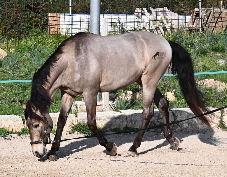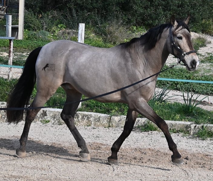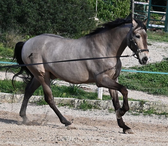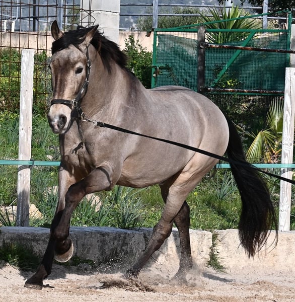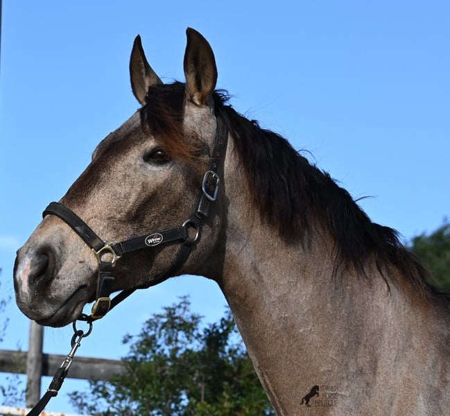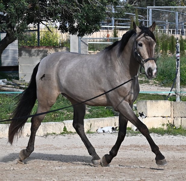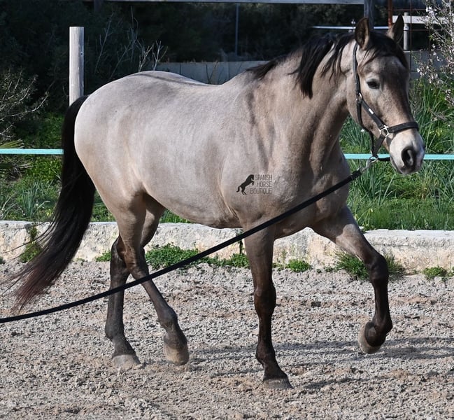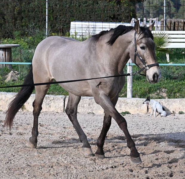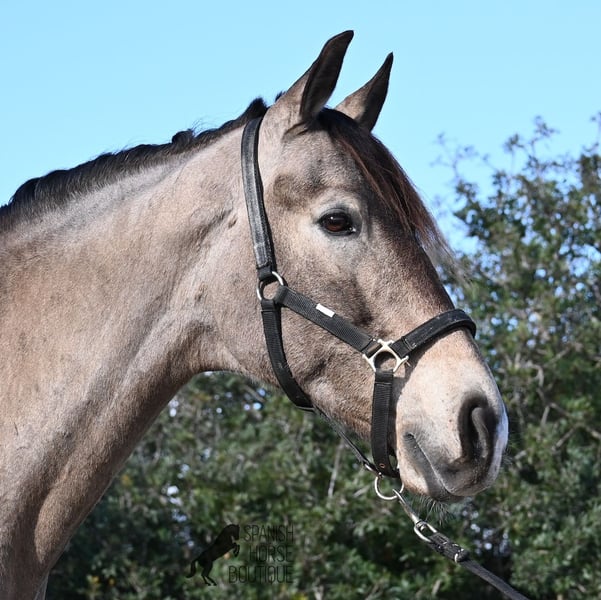 This 2010 born dun (currently in winter shearing, hence the gray color), is a mix of Lusitano and KWPN. He and his owner have been very successful in the dressage arena and have placed several times! Lateral movements, flying changes, canter pirouettes - all a piece of cake for this gelding. He also enjoys going into the field and even parades, such as the traditional animal consecration, with loud music and crowds of people, don't bother him! He is a real treasure to handle, a real protector and gentleman who never takes a wrong step or makes a wrong move. On the lunge he runs like clockwork, responds really well to voice commands and is also clever, because it was very windy at the photo shoot and he had his ears set to aerodynamics ;) Under saddle he WANTS to work and really blossoms. So he is a horse for someone who encourages him and works him 5 times a week, because the two performance breeds in his blood want to be kept busy. It is better to work him 7 times a week than only twice, which is why he is not really suitable for casual leisure riding. As a show professional, he is also easy to load, knows how to be in new places and in his summer dress he is also a real treasure on the outside (photos available). He has also been shown at shows by teenagers with riding experience and behaved well - but they were also kids who can really control his gas ;) He has been a gelding for a long time, so he could easily be integrated into a mixed herd. A fun horse for ambitious riders in his prime! He is currently on Mallorca! Videos and pedigree available on request. I would be happy to organize an AKU, riding, transport or even your trip if you come to see him in person. Details can be found on my website or in conversation. Saludos from Spain