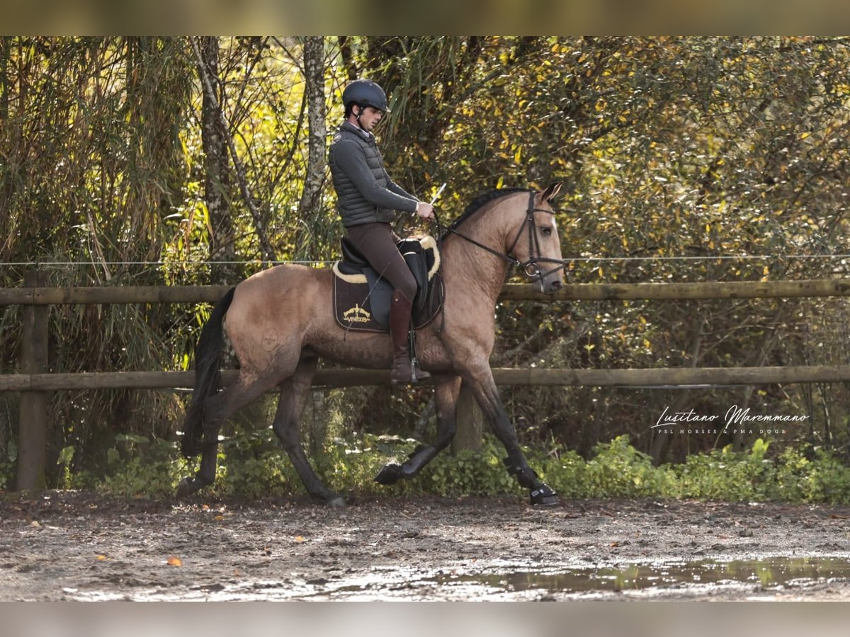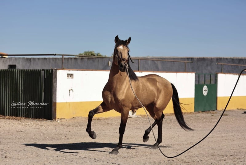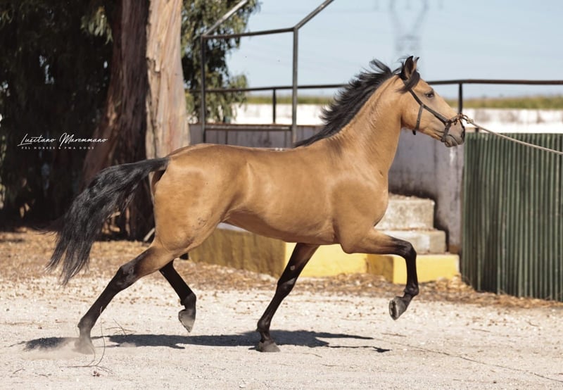 Beautiful PSL gelding in golden buckskin color Features: - Breed: Lusitano - Gender: Gelding - Year of Birth: 2020 - Color: Buckskin - Height: currently 152 cm, will grow a few more centimeters QUIXOTE is a young purebred Lusitano gelding (PSL) who impresses not only with his extraordinary color but also with his honest character and solid foundation. • Age / Height: currently about 1.52 m, final height approximately 1.54–1.55 m • Color: Buckskin – shimmering gold, very striking and noble • Pedigree: o Sire: URANIO (from SOCIEDADE DAS SILVEIRAS) o Dam: JERUPIGA, awarded 70 points • Health: up-to-date vet check without any issues • Training: Basic riding – confidently performs all three basic gaits, always well-behaved, uncomplicated, and with a good work ethic • Character: freshly started, very well-mannered in handling, people-oriented, and pleasantly uncomplicated. He remains calm, friendly, and eager to learn in every situation. QUIXOTE has everything one could wish for in a young Lusitano: excellent pedigree, best health, solid foundation under saddle, and a character that makes him a lifelong partner. His golden exterior completes the overall package. A horse with enormous potential – both for the leisure rider looking for a reliable companion and for riders seeking a special horse with prospects. I would be happy to provide more pictures and videos upon request.