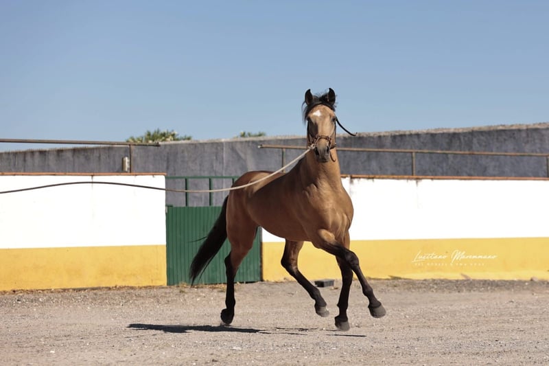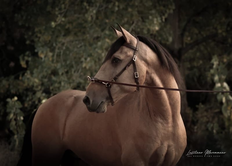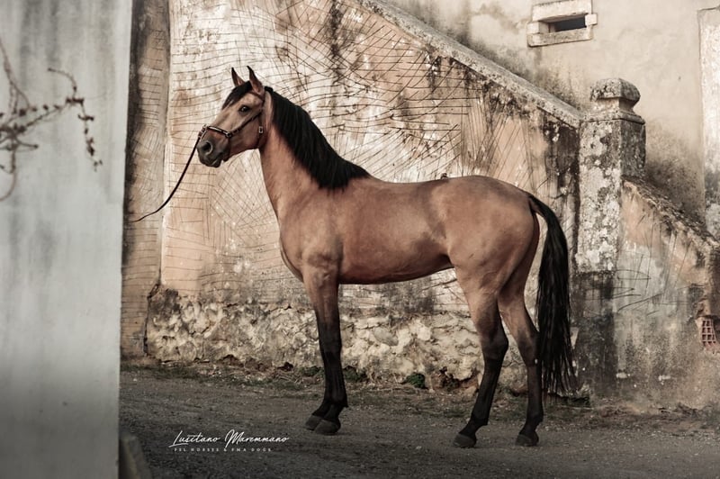 Beautiful PSL gelding in golden buckskin color Features: - Breed: Lusitano - Gender: Gelding - Year of Birth: 2020 - Color: Buckskin - Height: currently 152 cm, will grow a few more centimeters QUIXOTE is a young purebred Lusitano gelding (PSL) who impresses not only with his extraordinary color but also with his honest character and solid foundation. • Age / Height: currently about 1.52 m, final height approximately 1.54–1.55 m • Color: Buckskin – shimmering gold, very striking and noble • Pedigree: o Sire: URANIO (from SOCIEDADE DAS SILVEIRAS) o Dam: JERUPIGA, awarded 70 points • Health: up-to-date vet check without any issues • Training: Basic riding – confidently performs all three basic gaits, always well-behaved, uncomplicated, and with a good work ethic • Character: freshly started, very well-mannered in handling, people-oriented, and pleasantly uncomplicated. He remains calm, friendly, and eager to learn in every situation. QUIXOTE has everything one could wish for in a young Lusitano: excellent pedigree, best health, solid foundation under saddle, and a character that makes him a lifelong partner. His golden exterior completes the overall package. A horse with enormous potential – both for the leisure rider looking for a reliable companion and for riders seeking a special horse with prospects. I would be happy to provide more pictures and videos upon request.