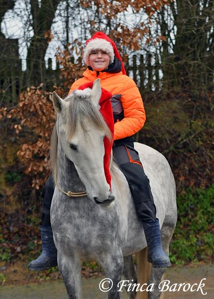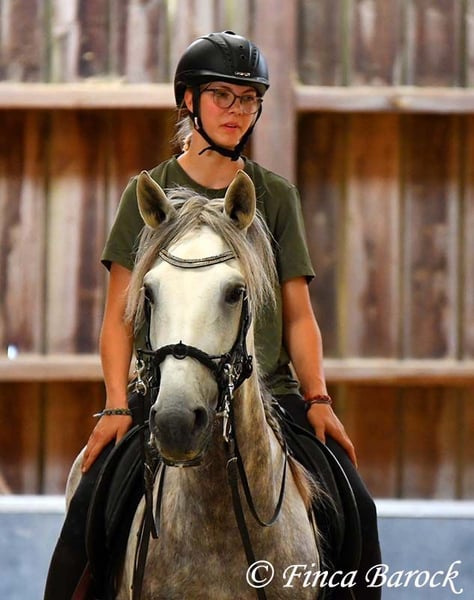 Breed: PSL Name: Quartzo LF Gender: Gelding Height: 16.2 hh Date of Birth: May 29, 2020 Color: Grey (Dun) Price: €14,900 Sire: Atrevido v. Iraque Dam: Doninha II v. Rubi Quartzo is a typy Lusitano with a friendly character and comfortable, balanced movements. He is extremely affectionate and people-oriented. In addition to his good conformation and temperament, he impresses with his rideability and willingness to learn. His uphill canter is particularly remarkable; riding him feels like floating on clouds <3. When faced with unfamiliar situations, Quartzo tends to pause but is easily persuaded to pass by new objects or obstacles. He loves water and enjoys splashing in puddles — a real highlight for him! Currently, Quartzo is in training for walk-trot transitions under saddle. Lateral work such as shoulder-in and travers on the ground already go very well, and he has begun working on travers. From the ground, we are also working on Spanish walk, and he already shows very nice, elevated steps. Overall, we experience Quartzo as a very confident, attentive horse that enjoys new challenges. And that canter... <3 He loves free jumping and hacking out. Overall, he is very versatile — whether work on the lunge, double longe, trail riding as a lead horse, or riding with a partner. Quartzo is sensitive and needs a clear, consistent rider. He is not suitable for beginner riders. He always wants to please and is extremely eager to do everything correctly. If you ask the same lesson three times in the same spot, he quickly anticipates it. A true delight for the refined rider who desires a responsive, clear-headed horse. Quartzo is used to herd life and gets along well with a variety of other horses. Includes veterinary examination and X-rays. Contact: Finca Barock, Tel. 0173-696 31 81, 56291 Wiebelsheim