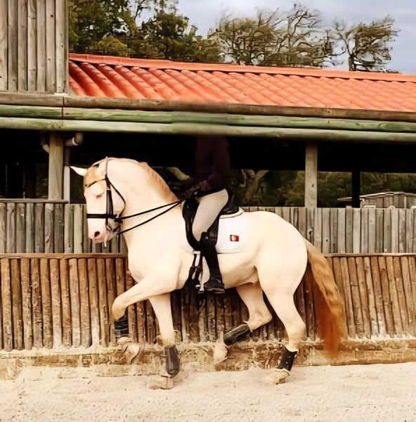 2015, 1.68 m, Cremello, stallion approved APSL Lusitano, currently training some Grand Prix elements. ¡AHORA DISPONIBLE PARA LEASING O SOCIEDAD! ¡GRAN OPORTUNIDAD PARA PROFESIONAL O JOVEN REPRODUCTOR! Contáctame para discutir condiciones. Para quien necesita un caballo patrocinado, por una fracción de lo que cuesta comprar un caballo de competición. Un caballo absolutamente maravilloso, ahora en busca de un hogar excelente. Lotus fue aprobado como semental a los 4 años y ha competido en algunas exhibiciones locales de sementales, en Golega dos veces, además de ser un semental de cría probado. Todos sus hijos son altos, de color buckskin o una hembra cremello, con movimientos amplios y ya montados, mostrando y en competición. Con una mente excelente para amateurs y jinetes jóvenes. Grandes caballos. Lotus muestra buena potencia en piaffe, buen control en piruetas, es fácil y divertido. Cabeza, ojos, cuello y línea dorsal preciosos. Tiene una conformación perfecta, huesos sólidos, pies excelentes, resistente a terremotos, sin miedo, muy honesto. Sabe que es un semental de cría. Buscamos una buena pareja, ya que lo tenemos desde que tenía 3 años. Me gusta emparejar a mis caballos. Ideal para buenos jinetes amateurs, jóvenes o incluso como socio que también sea jinete, quizás necesites un buen caballo de exhibición. Contáctame y comenzamos una conversación. Estoy dispuesto a que vaya a un jinete excelente en Europa para mostrarlo más durante uno o dos años. Socio o inversor. También ofrecemos garantía de por vida en nuestros caballos. Lo conocemos, está en perfectas condiciones veterinarias, y si en algún momento el comprador no queda 100% satisfecho, puede devolverlo en Europa. Este video es una compilación para criadores. Nuevo video en breve. Tarifa de cría: 800€. Criado por Serra Neves, montado por Rafa Bastos. Sitio web: www.wildernessfarmdressagesales.com