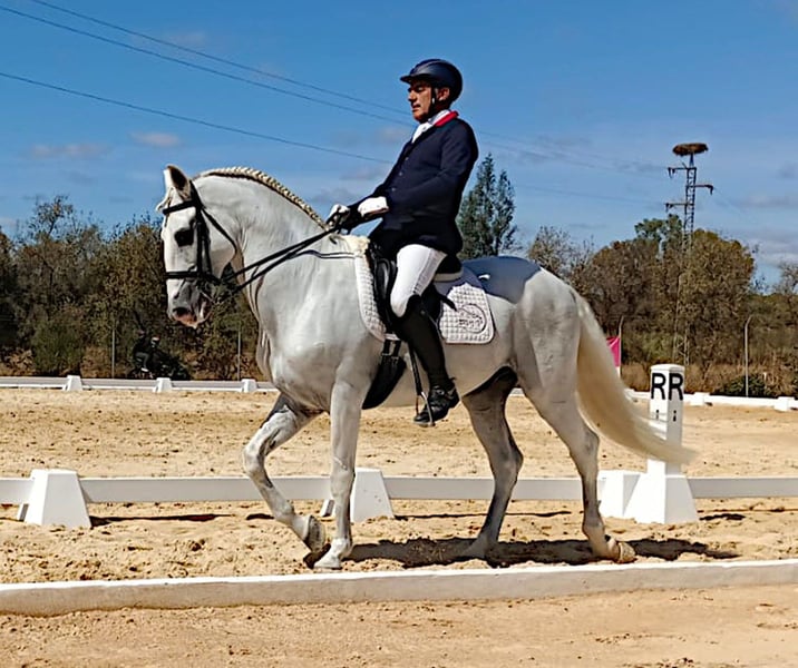 **Verkaufsanzeige: Eleganter Lusitano Hengst zu verkaufen** Wir bieten einen wunderschönen Lusitano Hengst zum Verkauf an, der durch seine Eleganz und sein beeindruckendes Auftreten besticht. - **Rasse:** Lusitano - **Geschlecht:** Hengst - **Geburtsjahr:** 2013 - **Farbe:** Schimmel - **Stockmaß:** 165 cm - **Ausbildungsstand:** Dressur Dieser charmante Hengst überzeugt nicht nur mit seinem edlen Erscheinungsbild, sondern auch mit seinem Talent und seiner Leidenschaft für die Dressur. Er zeigt sich stets motiviert und lernwillig, was ihn zu einem idealen Partner für ambitionierte Reiter macht. Der beeindruckende Schimmel ist sehr leichtrittig und kann auch von Kindern geritten werden oder als Lehrpferd dienen. Er hat aktuell beim Großen Preis von Andalusien teilgenommen. Wenn Sie auf der Suche nach einem Pferd sind, das sowohl im Viereck als auch im Umgang Freude bereitet, dann ist dieser Lusitano genau das Richtige für Sie. Bei Interesse freuen wir uns auf Ihre Nachricht und stehen für weitere Informationen und Besichtigungstermine gerne zur Verfügung.