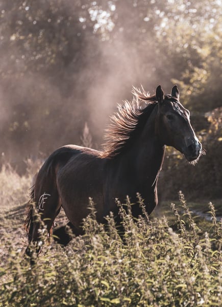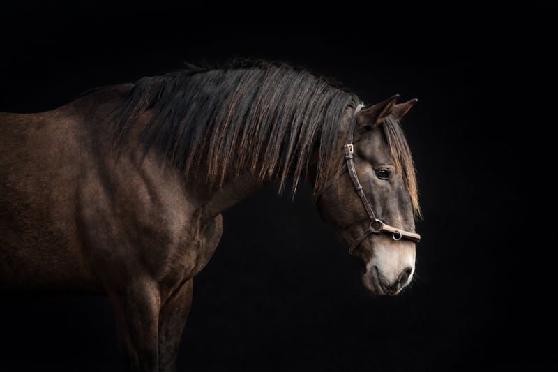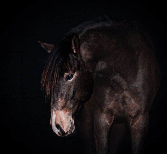 Hermoso potro joven de color castaño oscuro con manto buckskin