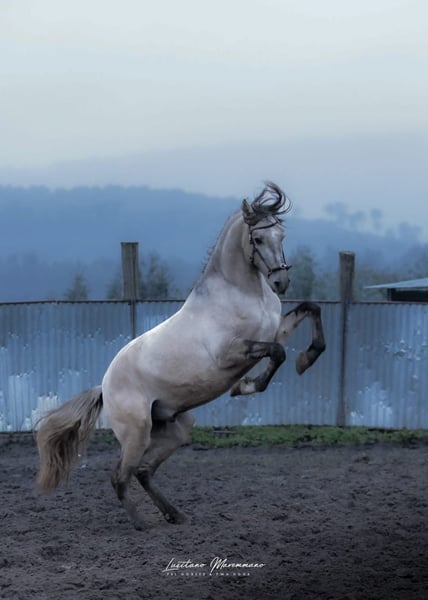 Young Lusitano stallion in a rare gray-dapple-shimmel coat, gentle, well-behaved, and talented! Features: - Breed: Lusitano - Gender: Stallion - Year of Birth: 2022 - Color: Gray-dapple-shimmel - Height: approximately 15.2 hh Description The three-year-old Lusitano stallion São Paio is now available for sale. He impresses with his exceptionally beautiful gray-dapple-shimmel color and his very sweet and human-oriented nature. He currently measures about 15.2 hh but will undoubtedly grow a little more. Training São Paio is currently in age-appropriate, gentle training. He is lunged, works calmly on the longe line, and has already been worked in all basic gaits under saddle. He accepts rider weight very well and consistently shows attentiveness, cooperation, and sensitivity to aids. His training will of course continue in a humane and patient manner, allowing him to develop positively. Movement & Potential Even in free movement, São Paio demonstrates good self-carriage, excellent basic gaits, and great talent for Working Equitation. His presence is elegant, always balanced, and pleasant to handle. Lineage São Paio comes from a remarkable pedigree – his grandsire is none other than the famous Escorial, which is clearly reflected in his quality, movement, and expression. Summary A young Lusitano with lots of charm, talent, and a special color, who will surely bring his future owner great joy—whether as a leisure partner, Working Equitation horse, or a future riding horse with potential. Additional photos and videos can be provided upon request.