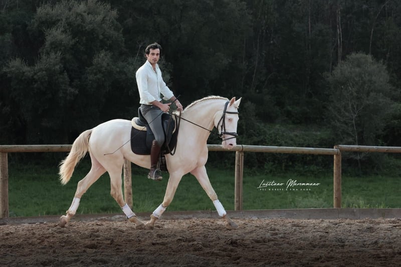 Promising Young Stallion with Top Pedigree & Quality for the Future Breed: Lusitano Gender: Stallion Year of Birth: 2022 Color: Cremello Height: approximately 15.8 hh (sire 16.9 hh | dam 16.0 hh – further growth expected) ⸻ For sale is an exceptionally talented young stallion who impresses not only with his high-caliber pedigree but also with his rideability, quality of basic gaits, and development potential. ⸻ 🏇 Training & Movement ✔️ Appropriately ridden in all three basic gaits for his age ✔️ Especially a very good, powerful canter ✔️ Pleasant to sit, clear in rhythm ✔️ Demonstrates rideability, balance, and willingness to learn ✔️ An ideal candidate for further training ⸻ 🧬 Outstanding Pedigree ✨ Sire: IMPERADOR DAS ARCAS • Licensed with over 72 points • Proven producer of quality, expression, and willingness to perform ✨ Dam: ALTIVA • Scored 79.5 points (almost 80!) • Represents excellent conformation, character, and movement quality ➡️ Two bloodlines that promise quality, athleticism, and a bright future. ⸻ 💎 Character & Potential SOUFLE D ARCOS presents as an attentive, honest, and cooperative young stallion. He is: • 🧠 eager to learn • 🤍 easy to handle • 🔥 motivated without being overexcited ➡️ An ideal horse for riders who want to build up steadily and are looking for a genuine young horse with substance. ⸻ 🎯 Conclusion A very interesting young stallion with: ✅ Top pedigree ✅ Solid basic training ✅ Excellent canter ✅ Clear potential for sport and breeding ⸻ 📞 Contact & Viewing SOUFLE D ARCOS can be viewed and tried in hand by appointment. I look forward to serious inquiries and am happy to take the time for a personal conversation.
