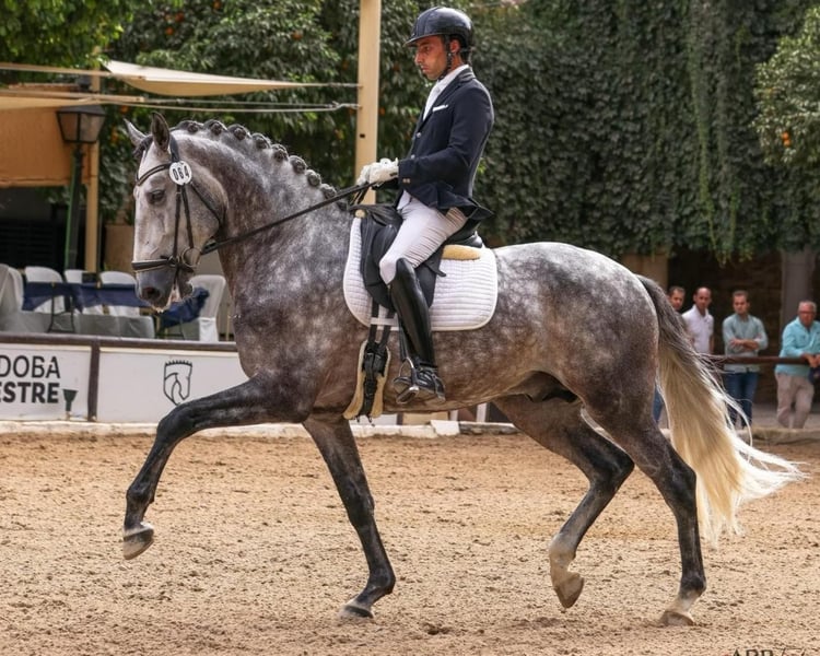 Spanish Dressage Champion This is an exceptional 6-year-old Lusitano stallion standing at 16.1 hh, approved for breeding. This horse consistently scores between 80-82% in competitions and has won the Spanish Championships in his age group against 70 warmbloods. He is currently one of the top young dressage horses in Spain and is a true Lusitano. He undoubtedly has a promising international career ahead of him and possesses immense talent. He is capable of performing flying changes, some tempi changes, piaffe, and all lateral work. Located in Spain. For more information, please contact via PM or WhatsApp at +49 176 99 73 34 004. Jasmin from Top Lusitanos