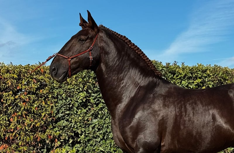 A very rare liver chestnut Lusitano 🥰 Obelix is a 7yro approved baroque Lusitano stallion with 170cm and piro free. I think he is the only Lusitano stallion with this colour and size. Obelix is like his name relative from the famous movies. A very gentle and sweet giant with a big heart, much patience and love. He is well trained and doing flying changes, canter pirouettes and lateral work. Piaffe started by hand and passage is started too. He can trot big too. He is for any kind of rider. A 13yro girl can ride him in Golega in a totally stressful situation with mares and other stallions and he is safe. This horse is a life insurance. An amateur or professional will enjoy this horse because he has good gaits and would be perfect for the dressage arena. His colour is very interesting. Some parts of his legs are more light and his mane is shimmering in a light red if it’s open in summer. Now in winter he becomes ebony dark. He has a long mane and much hair in general 😊 Obelix is approved for breeding and he is tested piro negative. He is something very special! Located in Portugal 🇵🇹 More informations over PM or WhatsApp +491786997334. Jasmin from Top-Lusitanos 🤗