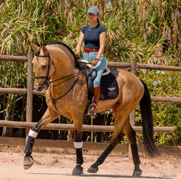 Stunning 6yro piro free buckskin Lusitano stallion with 172cm. This one is a gentle giant with a big heart. Very easy and uncomplicated in handling, always calm and friendly. The perfect ladies horse. He can do lateral work and flying changes, he knows to hack out alone or in the group. He is located in Portugal 🇵🇹 More informations over PM or whatsapp 00491786997334. Jasmin from Top-Lusitanos 🤗