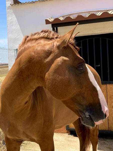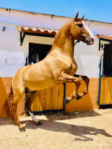 The golden horse 💛 Oro is a piro free 7-year-old Lusitano stallion standing at 165 cm, with a very rare color genetic; he is a red dun and has full APSL papers. Not only does his gold shimmery color stand out, but his heart is also made of gold. This horse has such a big heart and noble soul that you will fall in love with him immediately. Friendly, calm, patient, and very well educated. A complete dream. Absolutely safe and bombproof, a horse to enjoy. Oro is a perfect choice for working equitation, shows, or classical dressage. He has normal movements and is capable of lateral work, flying changes, and piaffe. He is located in Spain 🇪🇸 For more information, please contact via PM or WhatsApp at 00491786997334. Jasmin from Top-Lusitanos🤗