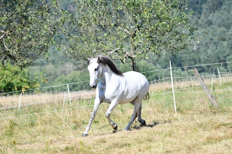 Une jument portugaise très typée, au style très baroque, avec beaucoup de profondeur de poitrine et des mouvements amples et dynamiques, qui font oublier qu’elle ne mesure que 1,59 m. Elle est très fière et dotée d’un caractère fort, avec beaucoup de puissance, sans être nerveuse. Étant donné mon âge, cette énergie deviendra trop importante pour moi à long terme (je ne suis pas toute jeune), je recherche donc une cavalière ou un cavalier plus jeune, qui prendra plaisir à développer cette énergie pour lui-même. Li est solidement dressée selon les principes classiques, maîtrise toutes les figures de côté en pas et en trot, piaffe et passage, en revanche, le galop n’est pas encore totalement développé. Elle vit en paddock, son comportement social est impeccable, mais comme elle est plutôt dominante, je pourrais également envisager qu’elle soit satisfaite d’une stalle paddock avec un accès à l’extérieur toute la journée.