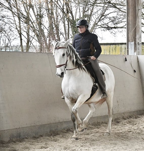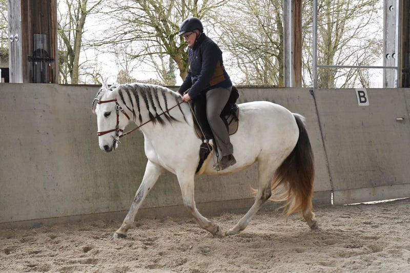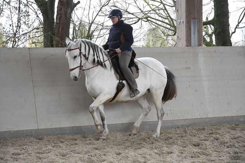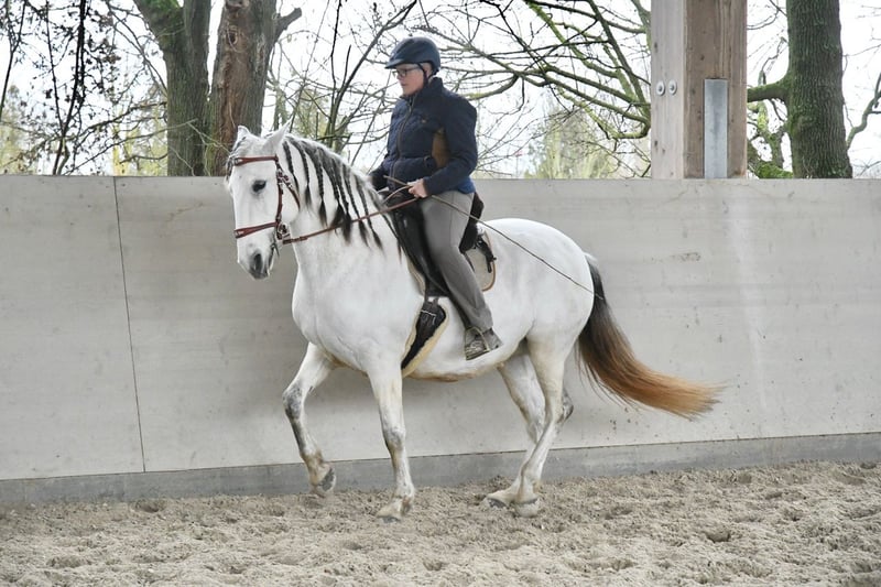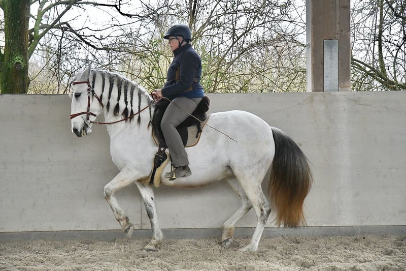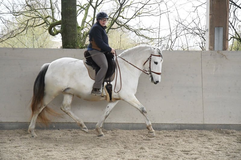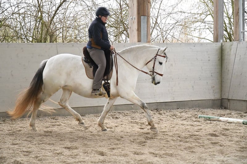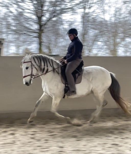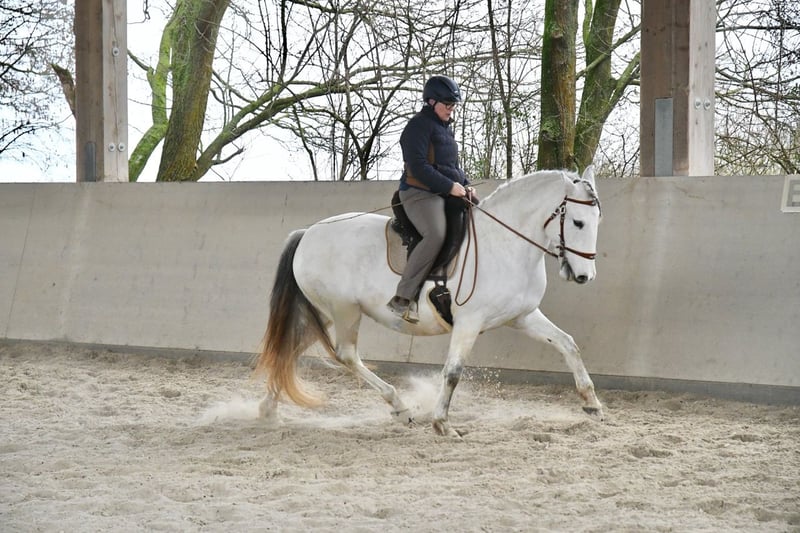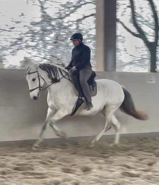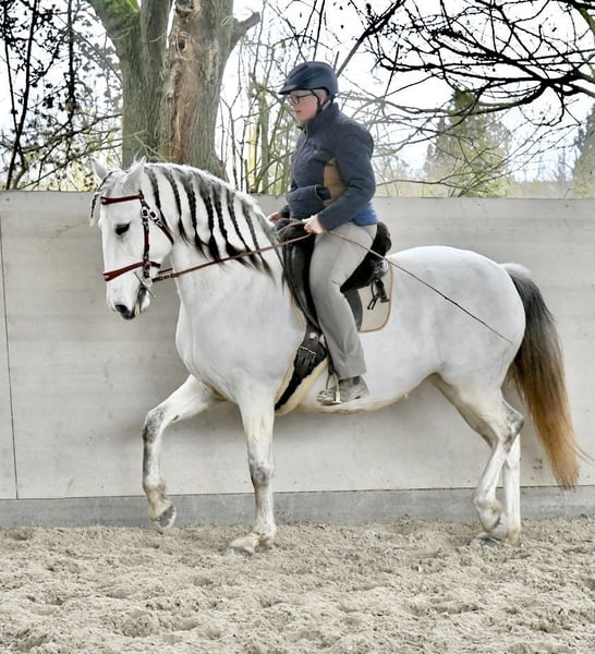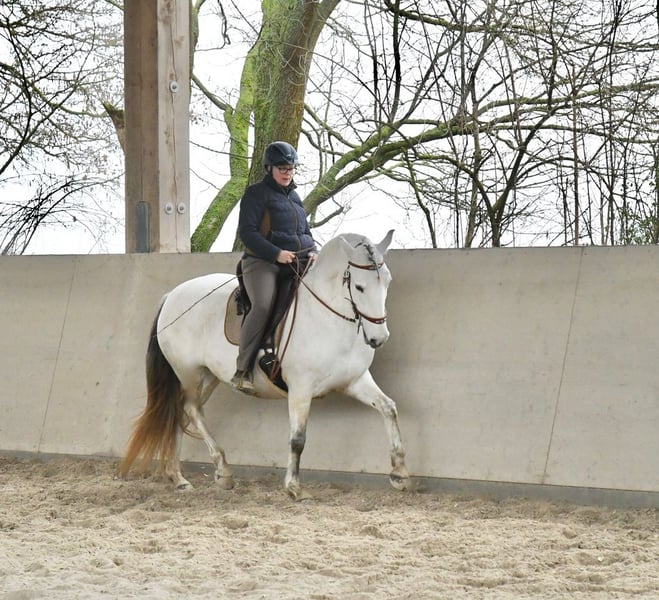 Aus Altersgründen suche ich für meine extrem ausdrucksstarke und mächtige Lusitanostute ein neues 5Sterne Zuhause. Li verfügt über drei sehr raumgreifende und schwungvolle Grundgangarten mit richtig Wumms. Sie ist reell und solide ausgebildet, beherrscht die Seitengänge in Schritt und Trab, hat eine gute Piaffe und eine weiche Passage. Sie hat ihr ganzes Leben in Offenstall/Weidehaltung verbracht, sie ist rangniedrig in der Herde und hat ein tadelloses Sozialverhalten. Sie wird nur in allerbeste Hände abgegeben.