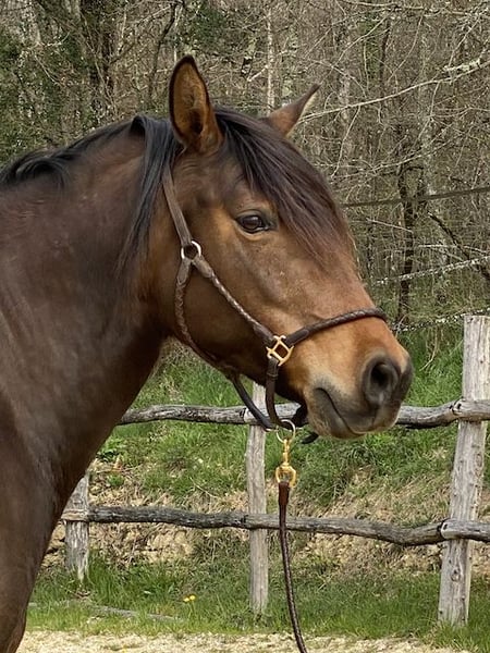 Julie de la Goudelie is a PSL mare of good origins, well-built, a little emotional but fairly reliable. She can be ridden in all three gaits, and will satisfy the needs of an experienced rider. Ethological awareness/desensitization work. Lives in a meadow with shelter all year round with her sisters and the other horses on the farm. Boxing for cold or rainy nights, and care. Dentist ok, worming two or three times a year. Mare with no particular difficulties, as long as you know how to speak horse.