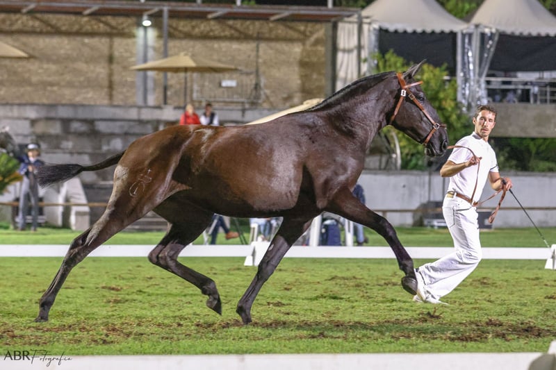 Serenata is a baroque young black mare with a small white snowflake on her forehead, and she outshines many stallions with her impressive physique. She was born at our stud farm (www.coudelaria-linda-oliveira.com) and enjoyed her childhood and youth in a herd environment, while also developing a daily connection with humans. As a result, she is a very sweet and people-oriented young lady who is at the beginning of her career as a riding horse. Now, at three and a half years old, she has been stabled, lunged, worked on the ground, and has recently been gently backed. She impresses us with her eagerness to learn and willingness to cooperate. A gem that will surely shine, she has an enormous presence and will be a loyal companion to her person. Of course, she still needs time in her training and can therefore stay with us for basic training. This is the opportunity to secure this magnificent jet-black Lusitano mare, as there are not many comparable horses available. Her pedigree is certainly interesting for breeding, and she can pass on the sought-after and rare black color in Lusitanos. She was successfully presented as a two-year-old at the young mares festival in Cascais. We would be happy to provide more videos and information via WhatsApp at +49 17644482124.