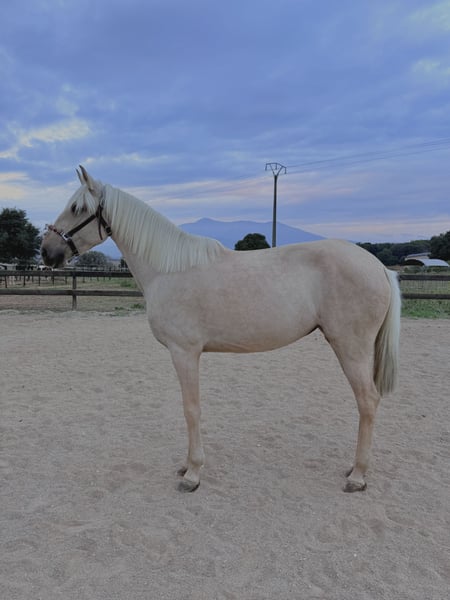 Exzellente isabelina Lusitana der Zuchtstätte SOL aus Spanien, mit hervorragenden Bewegungen, 4 Jahre alt und 1,62 m groß. Geritten in den drei Grundgangarten, mit Ziel und Potenzial für Turniere in der Dressur in vier Jahren. Sie zeigt ein sehr gutes Temperament beim Reiten und am Boden. Liebenswert, edel und mit einem sehr guten Kopf für ihr Alter.