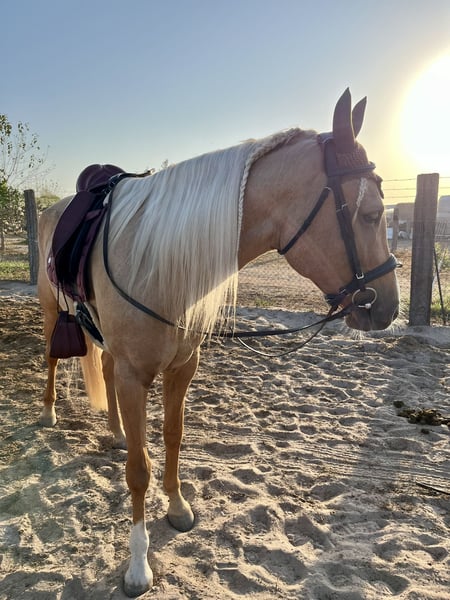 TRIANA – Hispano-Arabian x Lusitano Mare – Palomino – 5 years old For sale: Triana, an exceptional young mare combining beauty, top bloodlines, mental balance and a very solid foundation. A perfect partner for someone seeking a respectful, connected and enjoyable journey with a horse. Triana is Hispano-Arabian x Lusitano, by a Lusitano mare and the renowned Tapete YM (Military Stud). Registered in the ANCADES studbook – Spanish Sport Horse. Born: February 2021 (5 years old) Height: 163 cm Colour: Palomino Markings: facial star and one white hind sock She started her training in April 2025, following a calm, respectful and progressive approach focused on physical and mental well-being. Triana has an excellent foundation in liberty work: lying down on cue, following, rein-back, lateral movements, standing still and coming when called. She is voice-trained, making communication clear and effortless. Her training focuses on full-body awareness, proprioception and balanced muscle development. She enjoys varied outdoor terrain (hills and slopes), while arena work focuses on engagement of the hindquarters, correct use of the back and concentration. She works comfortably in walk, trot and canter, and hacks out alone or in company. Triana has already completed her first long trip to El Rocío, travelling by lorry and spending a week in a busy environment with carriages, riders and constant activity. Her behaviour was outstanding throughout. She is fully desensitised to traffic and surroundings: trucks, tractors, carriages, cattle, sheep, dogs, cyclists, etc. She is ridden bitless, though she also knows the bit. Very people-oriented, affectionate and eager to learn. Health & management Barefoot, never shod, hooves well adapted to hard and rocky terrain Regular trimming every 6 weeks, excellent behaviour with the farrier Early 2025: full dental check and teeth floated Regular equine osteopathy sessions In excellent health, fully vaccinated and dewormed Lives outdoors in a mixed herd, with shelter and free movement. Looking for a sensitive, kind rider to continue her education together.