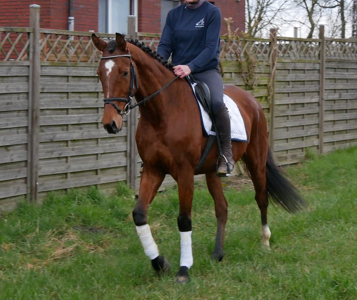 Naam: Szamoca Leeftijd: geboren 2020 Geslacht: ruin Schofthoogte: 167 cm Opleidingsniveau: bereden Deze geweldige ruin is de ideale partner voor de veeleisende vrijetijdsruiter. Hij is heel braaf en ongecompliceerd in de omgang en kan goed overweg met andere paarden. Szamoca is hardwerkend onder het zadel en werkt graag. Hij heeft een geweldige bergopwaartse galop en springt ook individuele sprongen met enthousiasme. Hij is niet springerig of schichtig in de wei. Hij heeft een paardenpaspoort zonder stamboom. Verder alles onder nummer 0176 62495567