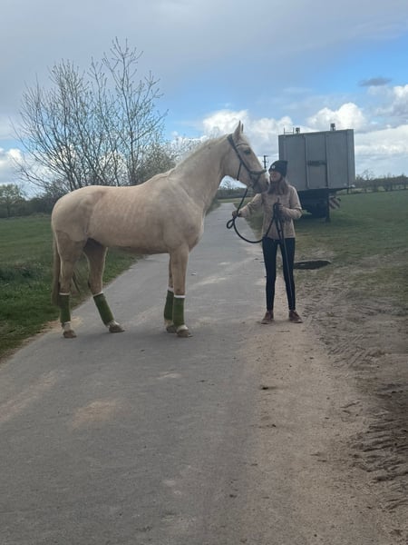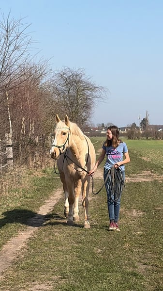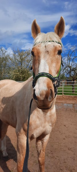 Zu verkaufen steht ein charmanter und Typvoller Palominowallach. Sancho am 29.05.2020 geboren und ca 165cm groß. Er ist nicht Beschlagen. Sancho ist ein sehr verschmuster und Menschenbezogener Wallach, der durch seine Palomino Optik sofort begeistert. Besonders viel Spaß machen ihm Ausritte und Spaziergänge ins Gelände. Bei der Bodenarbeit ist er immer motiviert dabei. Sancho kennt Doppellonge und ausgebundenes longieren. Aufgrund seines Alters ist Sancho kein Kinder oder Anfängerpferd. Er lässt sich lieb von älteren Kindern putzen. Ein Probereiten ist derzeit nicht möglich, da er länger nicht geritten wurde. Sancho wird auch an Händler verkauft. Bei Interesse und Fragen gerne per WhatsApp melden. Videos können geschickt werden. +4915739645591