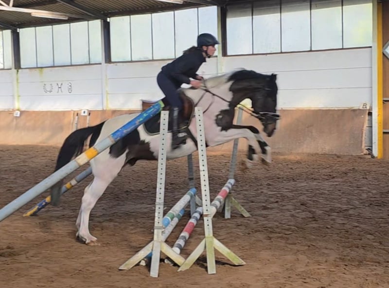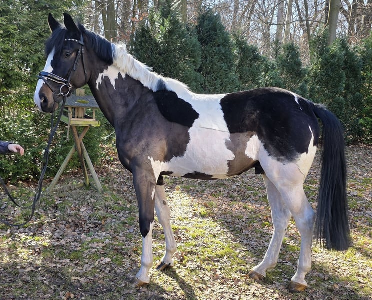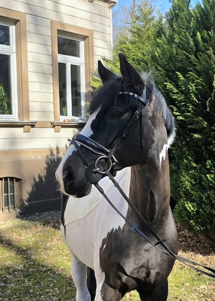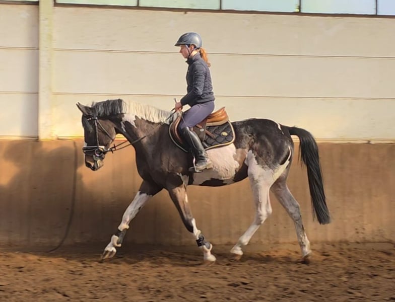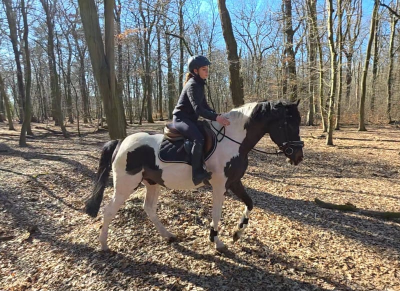 Clooney – sympathischer Scheckwallach mit tollen Nerven. Clooney überzeugt durch sein ausgesprochen freundliches Wesen und seine angenehme Art im täglichen Umgang. Er ist sehr menschenbezogen, brav und unkompliziert und zeigt sich auch in neuen Situationen erstaunlich gelassen und nervenstark. Unter dem Sattel präsentiert sich Clooney mit ansprechenden Grundgangarten und einem sehr angenehmen Reitgefühl. Besonders positiv fällt seine ruhige und ausgeglichene Art auf – für sein Alter zeigt er sich bereits bemerkenswert abgeklärt. Auch erste Sprünge meistert Clooney aufmerksam und mit sichtbarer Freude. Mit weiterer Förderung kann er sich daher gut zu einem Partner für kleinere Spring- oder Vielseitigkeitsaufgaben entwickeln. Im Gelände zeigt sich Clooney brav, zuverlässig und entspannt und genießt die gemeinsame Auszeit außerhalb des Reitplatzes sehr. Damit eignet er sich hervorragend als vielseitiger Freizeitpartner, der seinem Reiter sowohl im Alltag als auch bei Ausritten viel Freude bereitet. Im täglichen Handling ist Clooney absolut unkompliziert – Verladen, Schmied und auch Scheren sind problemlos möglich. Ein sehr sympathischer junger Wallach, der durch seine Nervenstärke, sein freundliches Wesen und seine Vielseitigkeit überzeugt und seinem zukünftigen Besitzer viel Freude bereiten wird. Bei uns steht er nachts in der Box und tagsüber in einer Wallachgruppe draußen. Er war aber auch Offenstallhaltung und Weidegang gewöhnt. 6j WB Wallach, 1.65m Klinische Aku vorhanden Videolink: https://youtu.be/2gdJFO334cQ?is=xeszbgTMWuCBM8IU Preisrahmen 5000- 10000€ Noch mehr Fotos, Videos und kleine Einblicke in den Alltag unserer Pferde gibt’s auf Instagram: [maresi_lange]. Schauen Sie gern vorbei und lernen Sie unsere Vierbeiner schon vorab ein bisschen kennen. You can find more photos, videos and little insights into the everyday life of our horses on Instagram: [maresi_lange]. Feel free to take a look and get to know our horses a bit better in advance.“ Weitere Pferde auf meiner Homepage MaresiLange.de oder auf Anfrage. Die Beschreibung des Pferdes beruht auf subjektiven Eindrücken und Erfahrungen unsererseits und ist keine Beschaffenheitsvereinbarung und Zusicherung von Eigenschaften. Probereiten erfolgt auf eigene Gefahr. Verkauf erfolgt im Auftrag. Für das Vorstellen/ Probereiten des Pferdes erlauben wir uns eine Aufwandsentschädigung in Höhe von 30 Euro zu berechnen. Diese wird natürlich bei Kauf des Pferdes verrechnet.