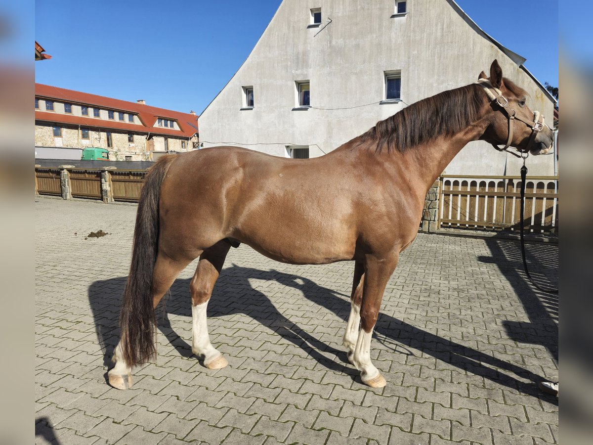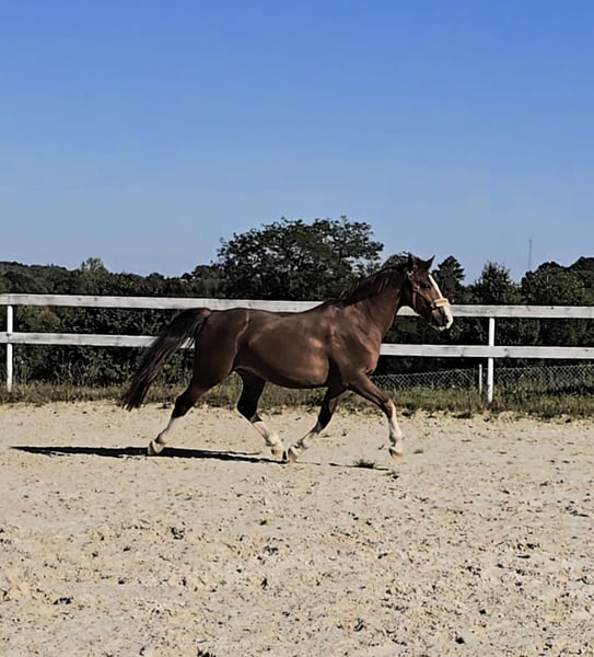 Schön gezeichneter, kleiner Warmblutpferd zum Verkauf. Ca. 155 cm Stockmaß, edler Typ. Mutter: Iskierka Wlkp nach Faust OO Vater: Kaleń Śl. nach Lombard Śl. Geboren 2019. Ich habe ihn gekauft, als er 1,5 Jahre alt war, und seitdem ist er in meiner Obhut. Sein Ausbildungsstand ist als vorerst eingeritten mit Problemen, die noch bearbeitet werden müssen. Er wurde von Anfang an auf die Grundausbildung trainiert. Mit drei Jahren begann die Arbeit mit Sattel und Longe, er nahm den Reiter mit stoischer Ruhe auf, es gab keine Probleme beim ersten Aufsteigen und Reiten. Seit einiger Zeit zeigt er jedoch Schwierigkeiten mit dem Reiter auf dem Rücken, als hätte er Angst davor. Er ist sehr sensibel und freundlich, ruhig bei Pflege und Hufschmied, mag Wasser und Sprühflaschen nicht, aber bei systematischer Arbeit gewöhnt er sich schnell daran. Von seinen Vorfahren hat er die besten Eigenschaften geerbt: kräftige, harmonische Konstitution, gerade, gesunde Beine, starke Hufe, widerstandsfähig gegenüber Witterungseinflüssen, nicht dicker, keine Krankheiten, nie verletzt. Er nutzt jede Futterration sehr gut (was sich in Übergewicht zeigt). Er wird von morgens bis abends in der Herde auf der Weide gehalten, im Sommer auch nachts. Im Herdenverband ist er nicht dominant, lässt sich aber nicht alles gefallen. Geimpft, entwurmt und regelmäßig entwurfsystematisch behandelt. Der Pferd frisst nur nach der Mahlzeit, eine Gastroskopie wurde nicht durchgeführt. Er zeigt keine Schmerzen oder Anzeichen von Magengeschwüren. Es könnte eine Gewohnheit nach dem Fressen sein, da er als 2,5-jähriger Hengst während der Abwesenheit der Stallbesitzerin in einer Box gehalten werden musste. Niederschlesien, Jelenia Góra