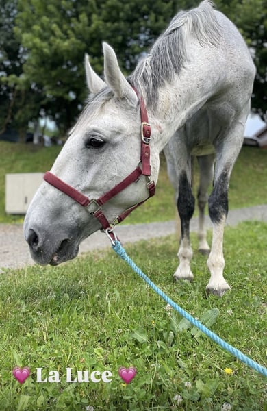 La Luce è una splendida e dolce amazzone di 10 anni, ideale per cavalieri amatoriali ambiziosi. La cavalla è sempre facile da gestire, molto sensibile al comando e risponde perfettamente a tutte le indicazioni. Naturalmente, è anche in grado di eseguire cambi di galoppo volanti. Anche nel rapporto con le persone, la cavalla è una vera gemma e può essere facilmente condotta e spazzolata anche da bambini piccoli. La Luce conosce il box e il paddock, è molto socievole con la sua compagnia e attualmente ha le ferrature complete. Se La Luce ha suscitato il tuo interesse, non esitare a contattarmi al numero 0664 5372919.
