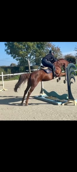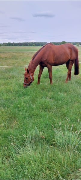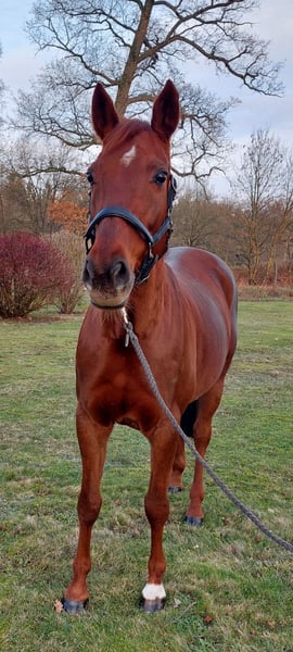 Zum Verkauf steht diese hübsche, ca. 162 cm große, 12jährige Maus. Es handelt sich um einen Vollblut/Warmblut-Mix. Sie ist Barhuferin und kommt damit prima klar; kennt es aber auch beschlagen zu werden. Mehrtägige Pausen sind für sie überhaupt kein Problem. Aktuell steht sie nachts in der Box. Tagsüber freut sie sich auf dem Paddock bzw. in den Sommermonaten auch gerne ganztägig auf der Weide zu sein. Sie ist leichtrittig, springt spielerisch fliegende Wechsel und gibt selbst Springanfängern am Sprung ein sicheres Gefühl. Des Weiteren hat sie sehr viel Freude an Gruppenausritten im Gelände. Egal ob im Gelände oder auf dem Reitplatz: hier interessieren sie weder Trecker, Autos, Quads, Hunde und Co. Auf Stimme hört sie prima und lernt Neues super schnell. Auf Springturnieren war sie ebenfalls früher erfolgreich unterwegs (A-Niveau). Sie steht bei uns auf Strohpellets und bekommt Heulage, da sie Asthma hat. Damit klappt es wunderbar. Auch im Offenstall könnte ich sie mir gut vorstellen. Sie ist kein Pferd für Angstreiter oder Einsteiger. Kein steigen oder ähnliches. Sie braucht einfach eine routinierte Bezugsperson. Selbst jüngere Kinder können sie wunderbar betüddeln, Hufe auskratzen, führen und Co. Eine tolle Allrounderin! Auf Wunsch kann gerne eine AKU gemacht werden. Ratenkauf oder zur Verfügung stellen ist nicht möglich. Es handelt sich um meine persönliche, subjektive Einschätzung. Überzeugt euch gerne selber, wenn ihr die Maus persönlich kennenlernt !