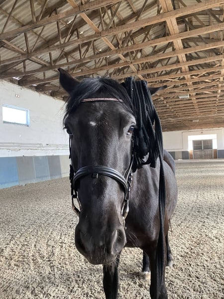 Unsere 13-jährige Stute Karmina, ein schweres polnisches Warmblut mit einem Stockmaß von 1,60 (ohne besondere Abstammung), sucht ein neues Zuhause. Sie ist charakterstark und deshalb nicht an Anfänger oder Kinder abzugeben! Sattel und Decken können ohne zusätzliche Kosten mit erworben werden Ich selbst, die Tochter, habe Karmina 2019 mit 12 Jahren bekommen. Sie war für mich ein gutes Lehrpferd, auch wenn der Umgang mit ihr anspruchsvoll war. Seit ich jedoch im Berufsleben bin, fehlt mir die Zeit für regelmäßiges Training. Daher hat meine Mutter die Arbeit mit ihr vor etwa 3 Jahren übernommen. Nun kann aber auch sie aus zeitlichen Gründen nicht mehr die konstante Betreuung gewährleisten, die Karmina benötigt. Sie wird momentan von einer Reitbeteiligung geritten. Karmina kennt Offenstall, Box und Halle sowie Longe und Roundpen. Sie geht sicher im Gelände, auch alleine, und ist an Straßenverkehr sowie an Tiere wie Hunde und Katzen gewohnt. Bei Hufschmied, Tierarzt, Zahnarzt und Sattlerin zeigt sie sich stets freundlich und unkompliziert. Sie braucht geistige und körperliche Auslastung und eine Bezugsperson, die klar, konsequent und gleichzeitig einfühlsam mit ihr arbeitet. In der Herde zeigt sie ein dominantes Verhalten, weshalb ein passendes Umfeld wichtig ist. Im Galopp hat sie noch Schwierigkeiten mit dem Gleichgewicht und neigt dazu, in den Kreuzgalopp zu fallen, was weiter trainiert werden sollte. Für die Dressurarbeit ist sie geeignet, fürs Springen jedoch weniger. Wir geben Karmina nur in liebevolle, erfahrene Hände ab. Uns ist wichtig, dass sie nicht weitergereicht wird wie ein Wanderpokal, sondern ein dauerhaftes Zuhause findet, in dem man sie versteht, ihre Art respektiert und ihr die Führung gibt, die sie braucht. Bei Interesse gerne melden und wenn Bedarf auf Videos besteht