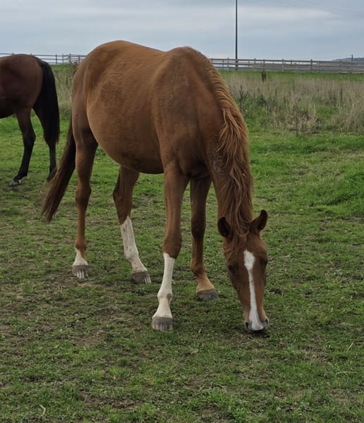 Szeroka klacz ruda o doskonałym rodowodzie: Coros od Cornet Obolensky z matki po For Pleasure. Klacz jest jeszcze nie w pełni wytrenowana.
