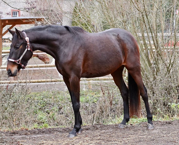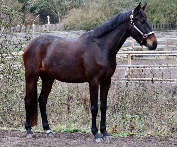For sale is an elegant warmblood mare on behalf of the breeder. This beautiful dark bay warmblood mare, born in 2021, measures 157 cm at the withers. She impresses with her refined appearance and pleasant temperament. She is ideally suited for dressage and demonstrates plenty of talent and willingness to learn. This young and promising mare is perfect for riders seeking a reliable partner for dressage training and competitions. She has been lovingly raised and is in good training condition. If you are interested or would like more information, please feel free to contact me. See for yourself this charming horse! Dori is currently barefoot! She is shoe and loading friendly. Also suitable as a perfect pony for transitioning from a smaller horse. Please no emails! Only phone calls or WhatsApp at +49 171 5348287.