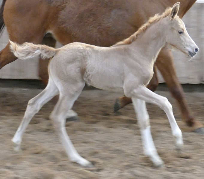 Today, new photos of our enchanting Palomino princess Marylin Gold have been taken. The daughter of Michelangelo x Ismo captivates not only with her golden coat but also with impressive movement quality and natural athleticism. She possesses everything one could wish for a future career in eventing or show jumping.