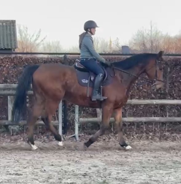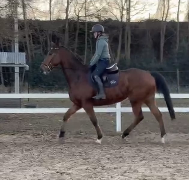 ruin van 175 en bijna 7 jaar Kent de 3 gangen netjes . Zal niet bokken of steigeren . Kan zeker op buitenrit mits deze leukerd 99% bomproof is en dus van weinig onder de indruk. Heel braaf in omgang , kudde en stal . Opzadelen , opstappen , alles blijft hij netjes staan .