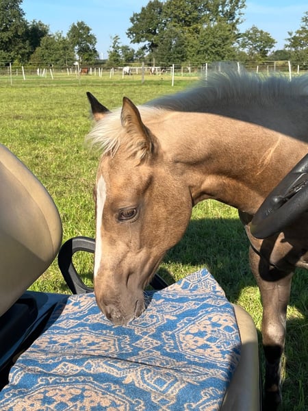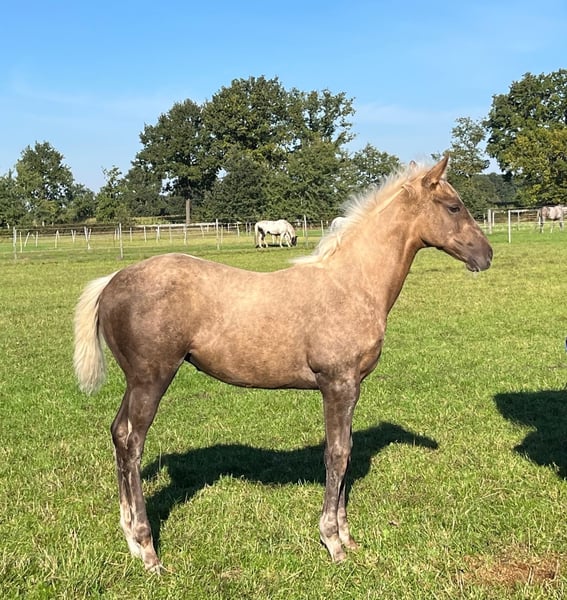 For sale is an exceptional Palomino filly with a rare pure thoroughbred lineage, registered with the Oldenburg Horse Breeding Association. A rare color treasure with sporting potential. She combines the elegance and toughness of a thoroughbred with a modern, athletic conformation, complemented by a golden coat that makes her a real eye-catcher. People-oriented, the filly knows the basics: halter training, farrier, and trailer loading. She is self-assured, strong-minded, and fearless, with very good musculature. Currently, she lives with her mother and two uncles in a herd. Snowy's Cristobal xx has been successfully competed in show jumping and cross-country events and impresses with his good character. Lou's Lillyfee is performance-tested with the OS (foal premium). She has already produced a very typy and strong-minded 3-year-old buckskin son by Quaside. Prospects: Ideal for breeding, eventing, or show jumping – perfect for connoisseurs who love the extraordinary. Also suitable for demanding hobby riders. She can be weaned mid-December (born June 28). Only to be sold to competent hands.
