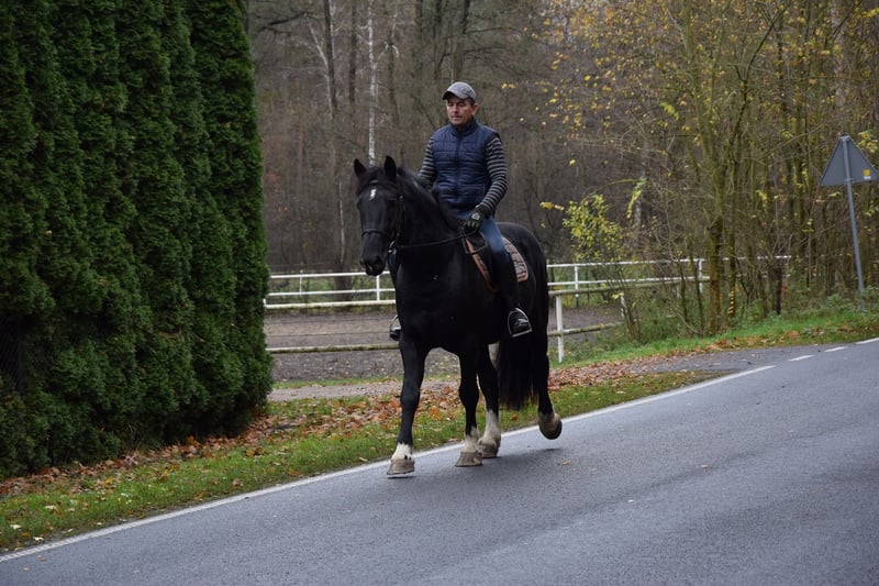 Dieser bildhübsche, lackschwarze Kaltblutmix (Vater: Kaltblut, Mutter: Warmblut) Wallach wurde 2021 geboren und misst aktuell 157 cm. Er besticht durch sein korrektes Gebäude, seine elegante Erscheinung und vor allem durch seinen besonders lieben Charakter. Menschen gegenüber zeigt er sich sehr zugewandt, freundlich, verspielt und aufgeschlossen. Trotz seines jungen Alters ist er bereits erstaunlich cool im Umgang und stets brav - sowohl beim Tierarzt als auch beim Hufschmied. Er wurde regelmäßig entwurmt. Besitzt einen Pass und ist mit verschiedenen Haltungsformen vertraut, darunter Boxenhaltung mit Weidegang sowie Herdenhaltung. Er befindet sich altersgerecht noch in der Entwicklung, wurde aber bereits spielerisch und mit viel Geduld angeritten. Unter dem Sattel zeigt er sich lernwillig, aufmerksam und vielseitig einsetzbar. Grot ist ganz bequiem und leicht zu sitzen. Lernt ganz schnell und ist focus am Arbeit. Schmied und Verladefromm. Mehr Infor gerne unter Whatsapp: +48784738028 Standort liegt in 86-200 Chelmno/Polen eine günstiger ist möglisch Weitere Bilder und Video steht unter unsere Internetseite: http://horseforsalepoland.weebly.com/grot.html