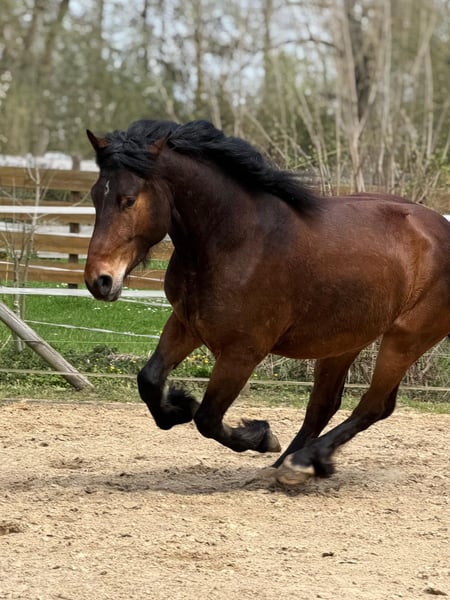 Zum Verkauf steht ein charmanter, fast 4-jähriger Kaltblut-Wallach mit einem aktuellen Stockmaß von 1,60 m. Dieser junge Mann ist ein interessanter Mix aus ungarischem Warmblut und Kaltblut, was ihm eine tolle Optik und eine angenehme Arbeitsbereitschaft verleiht. Ausbildungsstand & Training: Er wurde altersgemäß und schonend vorbereitet: • Longenarbeit: Er ist sicher an der Longe sowie Doppellonge in allen drei Grundgangarten gearbeitet (mit Kappzaum und Wassertrense). • Vorbereitung: Erste Erfahrungen in der Arbeit am Langzügel wurden bereits gesammelt. • Unter dem Sattel: Er kennt das Reitergewicht und wurde bereits im Schritt und etwas Trab angeritten. • Gelände: Er geht brav allein ins Gelände, aktuell noch als Handpferd. • Basis: Er ist fundiert in Bodenarbeit und Gelassenheitstraining geschult. • Er wird auch ein tolles Bild vor der Kutsche abgeben. Charakter & Alltag: Er ist ein liebes, herdenverträgliches und arbeitswilliges Pferd, das seinem Alter entsprechend sehr gut entwickelt ist. • Verkehrssicherheit: Autos sind gar kein Problem. Bei sehr großen Landmaschinen zeigt er sich aktuell noch etwas beeindruckt. • Umgang: Er ist brav beim Schmied sowie beim Tierarzt und hat bereits erste Trailerfahrten souverän gemeistert. • Haltung: Er ist an Offenstallhaltung gewöhnt, kennt aber auch die Box. Anforderungen an das neue Zuhause: Da er sich noch in der Ausbildung befindet, benötigt er eine konsequente Führung. Wir suchen daher jemanden mit Erfahrung im Umgang mit Kaltblütern, der ihn weiter fördert und ihm die nötige Sicherheit gibt. Platz vor Preis. Videos sind auch verfügbar