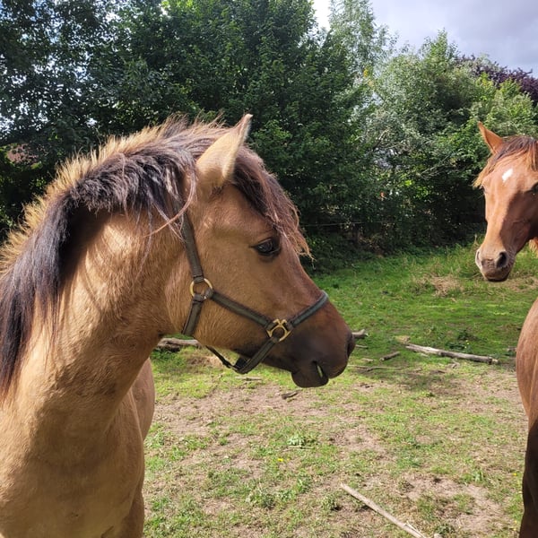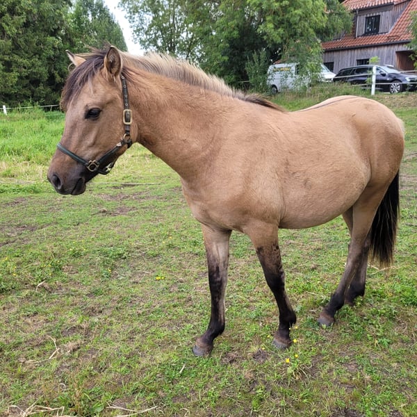 Cookie is registered as a German buckskin. At first glance, he stands out with his unusual grey-golden coat and beautiful eyes. His sire, Champ de Lux, is an elite stallion who has passed on Cookie’s expected pony-sized height as well as his willingness to work. Cookie is exceptionally friendly and has been easy to handle since a young age, whether leading, loading, or during hoof care. Due to age, we are very reluctant to part with our buddy and are looking for new owners who have experience in backing and are seeking a reliable, fearless, and well-behaved large pony.