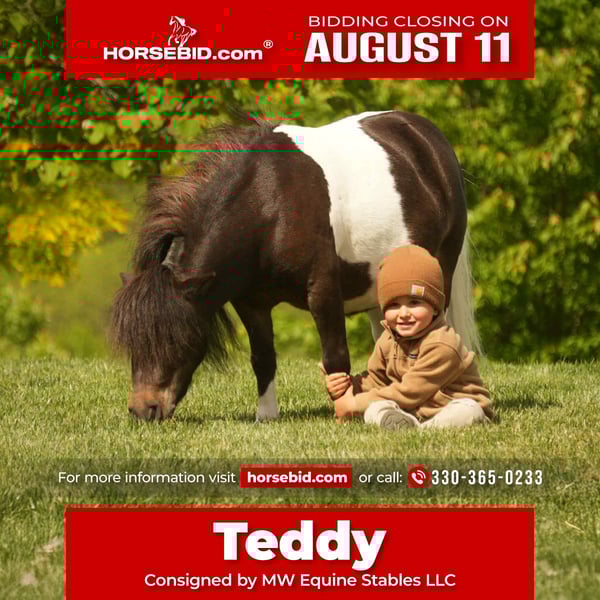 ⚜ The HERITAGE Classic ⚜ Happening now thru MONDAY | AUGUST 11th - Available EXCLUSIVELY on HorseBid's website! For more details and to register visit: www.Horsebid.com CONSIGNOR CONTACT: MW Equine Stables LLC 330-365-0233 LOCATION: Fresno, OH BREED: Mini Pony REGISTERED: No COLOR: Black & White HEIGHT: 32 inches AGE: 4 GENDER: Gelding Teddy is the Ultimate Babysitter Deluxe pony gelding.. Teddy has been our 6 yr olds favorite pony for the past year. He can do everything with him.. If you have been looking for the most bombproof pony that is BEEN THERE DONE THAT, Teddy is your guy. We will stand behind this gelding 100%. He is amazing and is guaranteed absolutely safe. Not only are you buying safety with this guy but your buying looks and lots of years left. He is the full package.Teddy is a great size, not too small or too large. Great mid size pony for any child from when they first start to at least 8 years old. He is VERY broke to ride and drive. Leadline, solo, put your kids only in the cart and trust him to pull them around very safely. He is 100% the definition of what a first pony to learn on should look like. He rides amazing.. We have hauled him to obstacle course and will do whatever you ask of him. He is absolutely easy to catch at all times. Not buddy sour at all, will stand tied all day long. Great for the farrier, has never foundered, extremely easy keeper, healthy in every way. He loads and unloads with ease. This pony is one in a million,. He will always stay the same even with a lot of time off. He will be the same and trust worthy every time. Nothing bothers him, not even new places. He has the mind of gold that we all wish we could put on every pony or horse. They do not come around like this often and honestly hardly ever. He is a saint. He is such a great prime age at 4 years old. There is so much left in him to give and he has been seasoned and has seen so much. You will not find one any more cute or conformationally correct either. You can be confident for your child to do anything on him in any direction. He has great smooth movement and stands to be crawled all over, saddled, mounted, etc. I cannot say enough good things about this pony. He is one of a kind. If you want to come check out how amazing he is before you buy, you are welcome to. If you have any questions at all or want to do a PPE at buyers expense just let me know! He is located in Fresno Ohio and shipping can be arranged nationwide. If you have been looking do not miss out or hesitate on this pony, there is absolutely nothing to worry about with your child’s safety or his health. Do not miss out on your chance. This guy will raise your kid up as safe as possible. Most solid pony that has ever came into our program. He deserves the very best home and will make sure he gets just that! Don’t hesitate to reach out to Marcus @ 330-365-0233.