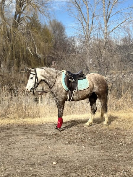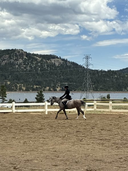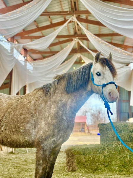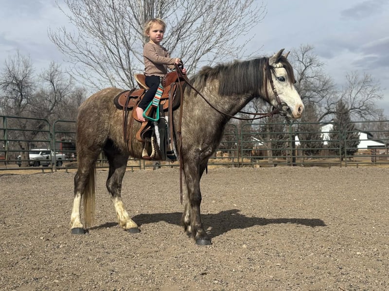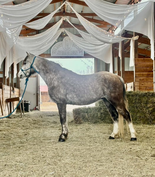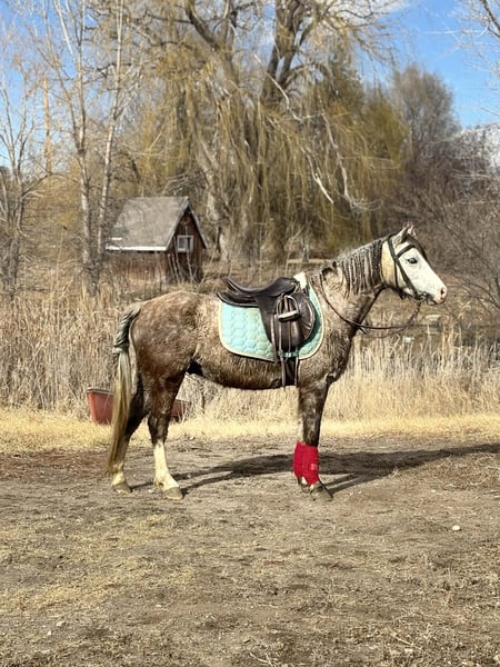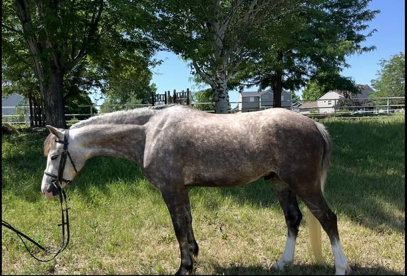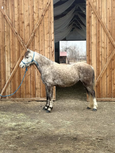 "AVAILABLE ON ONLINE HORSE AUCTION AT www DOT PlatinumEquineAuction DOT com BIDDING OPEN NOW thru SUNDAY | APRIL 19TH! *Final price will be determined on auction site* CONSIGNOR CONTACT INFO: Thea Park 970-632-3644 LOCATION: Fort Collins, CO ★★ SHOTGLASS BLUESTONE ★★ “Romeo” | 2021 Registered Welsh Pony Gelding | 12.2 Hands | Fancy • Fun • Kid-Approved Romeo is the definition of a dream pony. This 2021 registered Welsh gelding stands 12.2 hands tall and is as adorable as they come, with a perfect button nose, beautiful face, striking eye, and correct conformation to match. He’s the kind of pony that captures hearts the moment he walks out of the stall. Romeo is first to meet you at the gate and absolutely loves attention. With his goofy personality and sweet nature, he quickly becomes a favorite wherever he goes. He bonds easily with his people and has the kind of temperament that makes him a joy to have in the barn. Under saddle, Romeo is well-started and confidently progressing. He completed 90 days of jump training last summer and has been ridden and shown by lesson riders. He has a solid walk, trot, canter, and stop, a natural lead change, and transitions easily — cantering off a kiss and stopping off voice cues. He’s responsive, balanced, and incredibly fun to ride. He is reliable enough that my 2 year old daughter with very little riding experience can ride him around all by herself. Romeo has been shown at Estes Park and Copper Penny, hauling in, stepping off the trailer, and riding exactly the same as he does at home. His consistency and level-headed nature make him stand out in new environments. He also absolutely loves the trail. Romeo has been ridden extensively outside, confidently navigating dogs, bikes, running teams, strollers, traffic, and even busy downtown settings at night with music and crowds. He crosses water, bridges, tunnels, and will ride along the road without hesitation. Beyond riding, Romeo has a strong groundwork foundation and has been introduced to liberty work. He’s learning tricks like the step-up, bow, and lay down, and enjoys engaging with his handler. He’s also been ridden bareback and with a neck rope, has a finished neck rein, and moves nicely off leg cues. Romeo combines talent, brains, heart, and personality into one compact, eye-catching package. He has a wonderful foundation, a big try, and the kind of disposition that makes him truly special. If you’re looking for a fancy, safe, and versatile pony with show experience and real-world miles, Romeo is ready to be someone’s absolute favorite. Watch his extremely detailed video and come meet this standout little gelding in person — he’s every bit as cool as he sounds. For more information, contact Thea at 970-632-3644.