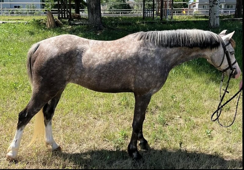 Pony Welsh gris de 4 años, extremadamente talentoso y aprobado por los niños