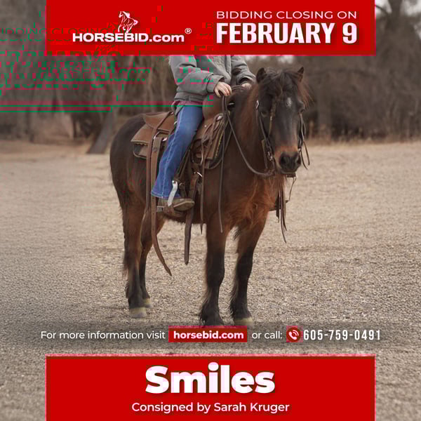 ❤️🔥𝑩𝒆 𝑴𝒊𝒏𝒆 𝐒𝐄𝐋𝐄𝐂𝐓❤️🔥 Happening now thru MONDAY | FEBRUARY 9th - Available EXCLUSIVELY on HorseBid's website! For more details and to register visit: www.Horsebid.com CONSIGNOR CONTACT: Sarah Kruger 605-759-0491 LOCATION: Brandon SD BREED: Pony REGISTERED: No REGISTERED NAME: Smiles COLOR: Brown HEIGHT: 40 inches AGE: 8 GENDER: Gelding Smiles is A once in a lifetime Pony that rides like dad’s big ranch using gelding, this little guy has a TRUE one hand neck rein! Has a ground covering walk has been used on the ranch in the shadows of dads big using horses. He will ride out alone like a dream has been hauled to several fun shows and playdays. The perfect trail riding pony and an absolutely joy to be around and have a handy kid enjoy. He is completely sound and health with zero issues or problems. Has been roped off of, runs the barrels and poles Smiles is special pony and deserves a little cowboy or cowgirl that’s going to enjoy him as much as we have.