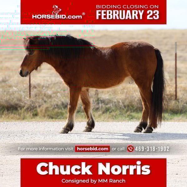 💎 𝐓𝐇𝐄 𝓓𝓲𝓪𝓶𝓸𝓷𝓭 𝐒𝐇𝐎𝐖𝐂𝐀𝐒𝐄 💎 Happening now thru MONDAY | FEBRUARY 23rd - Available EXCLUSIVELY on HorseBid's website! For more details and to register visit: www.Horsebid.com CONSIGNOR CONTACT: MM Ranch 469-318-1902 LOCATION: Forney, TX BREED: Pony REGISTERED: No REGISTERED NAME: Chuck Norris COLOR: Bay HEIGHT: 11 AGE: 8 GENDER: Gelding Chuck Norris is the perfect partner for all the crimes a kid could want to do!!! He is the prime age of 8 years old. He still has many years of growing up with kids and making their childhood dreams come true. If he sees you coming to the gate, he’ll meet you there everytime ready to put his head in the halter. He is easy to catch and LOVES people. He will follow the kids around for hours like he is a dog just waiting to be loved on and told what to do next. He rides like a big horse and has the mindset of one. He doesn’t mind a long day or work doing playday events, working on the ranch, trail riding or just stand being tied for hours while the little ones brush him. Chuck has done countless playdays and knows the events. He will walk, trot and lope all the events and go the speed you want him to. He can actually be very competitive with his times compared against full size horses and would be perfect for a little kid that is really wanting to start running barrel, poles, straights, etc. and then after they go compete, they can go home and jump on him bareback and just have fun. He will also ride English and go over jumps smoothly. My kids love loping him around the round pen bareback going over the jumps pretending they are in a jumping competition. He is very safe and has never offered to buck, kick or bite. He is not spooky. He doesn’t need to be warmed up no matter how long he has been turned out. He has been rode around traffic, dogs, goats, cows, traffic, gravel roads, through water and ditches. None of it bothers him. He’ll ride amongst all the big horses at a playday in the warm up pen, arena and parking lot and acts like one of them. Chuck Norris has very good ground manners, he stands still for brushing, saddling, fly spray, having all 4 feet cleaned out, etc. He is easily led up to a mounting block/fence (even bridleless/halterless) and will stand still for kids to get on. He is very easy to bridle for kids, loads in/out of the trailer with easily and safely, he isn’t pushy when they lead him, etc. Chuck is sound, healthy and ready to go have fun with a kiddo! He did have a pre vet evaluation done included in the pictures. If you have anymore questions about him feel free to call. We can also help arrange shipping if needed.