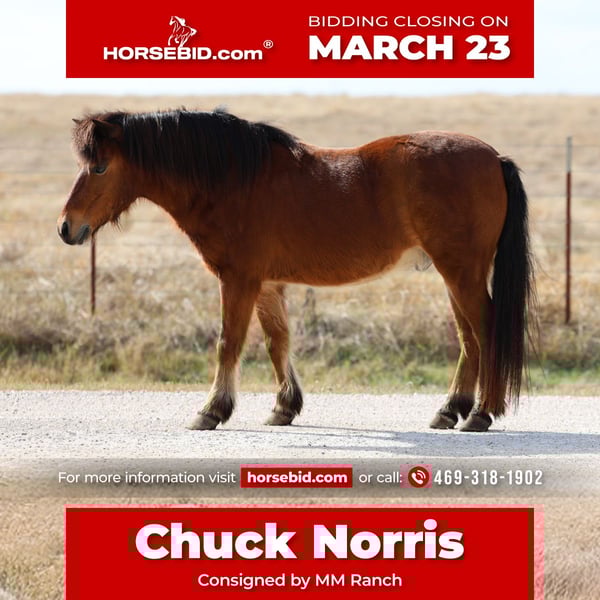 ⚜️𝓽𝓱𝓮 𝐆𝐎𝐋𝐃 𝓢𝓮𝓵𝓮𝓬𝓽⚜️ Happening now thru MONDAY | MARCH 23rd - Available EXCLUSIVELY on HorseBid's website! For more details and to register visit: www.Horsebid.com CONSIGNOR CONTACT: MM Ranch 469-318-1902 LOCATION: Forney, TX BREED: Pony REGISTERED: No COLOR: Bay HEIGHT: 11 AGE: 8 GENDER: Gelding Chuck Norris is the perfect partner for all the crimes a kid could want to do!!! He is the prime age of 8 years old. He still has many years of growing up with kids and making their childhood dreams come true. If he sees you coming to the gate, he’ll meet you there everytime ready to put his head in the halter. He is easy to catch and LOVES people. He will follow the kids around for hours like he is a dog just waiting to be loved on and told what to do next. He rides like a big horse and has the mindset of one. He doesn’t mind a long day or work doing playday events, working on the ranch, trail riding or just stand being tied for hours while the little ones brush him. Chuck has done countless playdays and knows the events. He will walk, trot and lope all the events and go the speed you want him to. He can actually be very competitive with his times compared against full size horses and would be perfect for a little kid that is really wanting to start running barrel, poles, straights, etc. and then after they go compete, they can go home and jump on him bareback and just have fun. He will also ride English and go over jumps smoothly. My kids love loping him around the round pen bareback going over the jumps pretending they are in a jumping competition. He is very safe and has never offered to buck, kick or bite. He is not spooky. He doesn’t need to be warmed up no matter how long he has been turned out. He has been rode around traffic, dogs, goats, cows, traffic, gravel roads, through water and ditches. None of it bothers him. He’ll ride amongst all the big horses at a playday in the warm up pen, arena and parking lot and acts like one of them. Chuck Norris has very good ground manners, he stands still for brushing, saddling, fly spray, having all 4 feet cleaned out, etc. He is easily led up to a mounting block/fence (even bridleless/halterless) and will stand still for kids to get on. He is very easy to bridle for kids, loads in/out of the trailer with easily and safely, he isn’t pushy when they lead him, etc. Chuck is sound, healthy and ready to go have fun with a kiddo! He did have a pre vet evaluation done included in the pictures. If you have anymore questions about him feel free to call. We can also help arrange shipping if needed.
