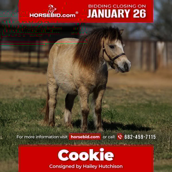𝐉𝐀𝐍𝐔𝐀𝐑𝐘 ⭐️𝑨𝒍𝒍 𝑺𝒕𝒂𝒓 𝑳𝒊𝒏𝒆𝒖𝒑⭐️ Happening now thru MONDAY | JANUARY 26th - Available EXCLUSIVELY on HorseBid's website! For more details and to register visit: www.Horsebid.com CONSIGNOR CONTACT: Hailey Hutchison 682-459-7115 LOCATION: Joshua, TX BREED: Pony REGISTERED: No REGISTERED NAME: Cookie COLOR: Buckskin HEIGHT: 38.5“ AGE: 8 GENDER: Mare Cookie is 8 years old, 38.5“ tall, buttermilk buckskin mare pony. Cute as a button & sweet as sugar! 🫶🏼 Safe enough for the kids to handle her & crawl all around her! Unphased by bouncy balls, dragging the toy bull, and all the chaos in between. Has mainly been a leadline pony, but will also ride out as well. Picks up all her feet, kind dispostion with no pony attitude, and not mareish. Cookie’s video speaks for it’s self- a great starter pony! Current on coggins, deworming, and farrier.