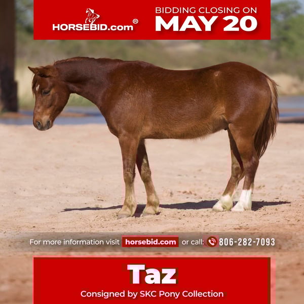 ▪️◽️ The May Classic ◽️▪️ Happening now thru MONDAY | MAY 20th - Available EXCLUSIVELY on HorseBid's website! For more details and to register visit: www.HorseBid.com CONSIGNOR CONTACT: SKC Pony Collection 806-282-7093 LOCATION: Canyon, TX BREED: Pony REGISTERED: No COLOR: Sorrel HEIGHT: 12.3 AGE: 6 GENDER: Gelding A kind eye, fun personality, old fashion shape, and easy going demeanor, make this pony a house favorite around here. Taz is not only broke to ride and drive the very best but he also knows some cool tricks like the curbside mount, laying down on command, and Saylor has even taught him to push the jolly ball around. Taz has an inquisitive mind and a big heart. He’s extremely trainable and only wants to please. At 12.3 hands he’s the perfect size for all ages of child. We have hauled him to numerous play days and to camping trips and parades. He has seen about all there is to see and always stays quiet and reliable. Taz will walk trot and lope easily and has a big stop. He is soft everywhere and is easy for the little ones to maneuver around. Call or text 806-282-7093 if you have any questions.