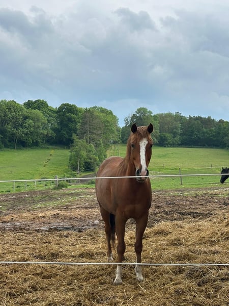 Ole is a handsome, western-trained small horse gelding born in 2017. With his friendly chestnut coat and a height of approximately 15.0 hands, he is a real eye-catcher. He impresses with good conformation and a balanced, friendly temperament. At the age of four, Ole was diagnosed with osteoarthritis in both knees; however, this only mildly restricts him. Recent X-rays show that his condition has not worsened over the past four years. With regular, consistent exercise and appropriate supplementary feed, he is suitable for riding as usual. He currently lives in a harmonious herd of geldings in an open stable and is only offered in outdoor turnout. Ole is farrier-friendly and is familiar with the veterinarian and trailer. Character-wise, he is gentle, people-oriented, and very friendly. Ole is open-minded, playful, and has a charming, humorous personality—sometimes quite the little rascal. Fundamentally, Ole is a balanced and reliable horse that can bring great joy in the right environment. Due to his playful nature, he is not suitable as a beginner or children's horse. However, with guidance from a trainer, he can also be well-handled by less experienced riders. Ole has solid western training, knows the terrain, and rides calmly in outdoor settings, although he could still gain more experience in this area. He was last regularly exercised about a year ago and should be gradually retrained. He is also familiar with English saddles and could be easily transitioned to English riding. Ole is being offered with a heavy heart, as his owners can no longer provide him with enough time, movement, and stimulation. He will only be placed in caring, responsible hands and is not intended for riding schools or dealers. His tack (except for the saddle) will be included.